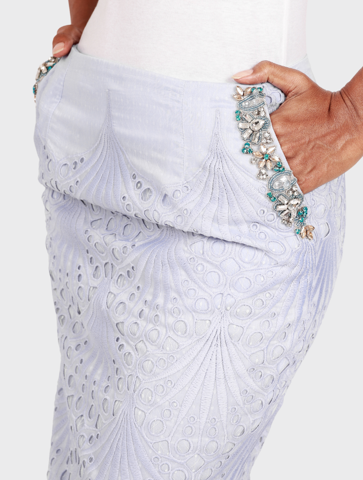 The Espiguette blouse in Indigo Blue is crafted from premium guipure lace with a luxurious glitter net lining. It features puff mesh glitter net sleeves, a refined embellished collar, and a hidden back zip with hook fastening. The non-stretch fabric and comfort fit cutting create an elegant, sophisticated silhouette.