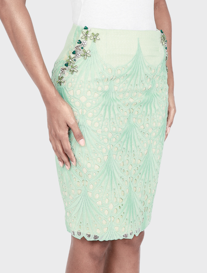 The Espiguette short skirt in Seafoam Green is crafted from exquisite guipure lace, lined with delicate cotton for added comfort. It features a hidden back zip and hook fastening for a clean finish. The non-stretch fabric and refined construction make this piece a standout in our exclusive collection.