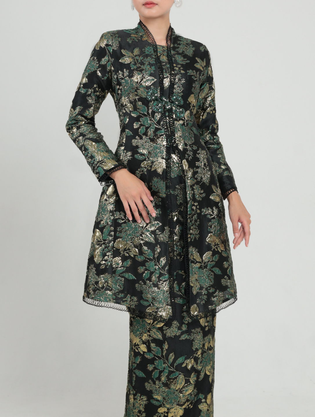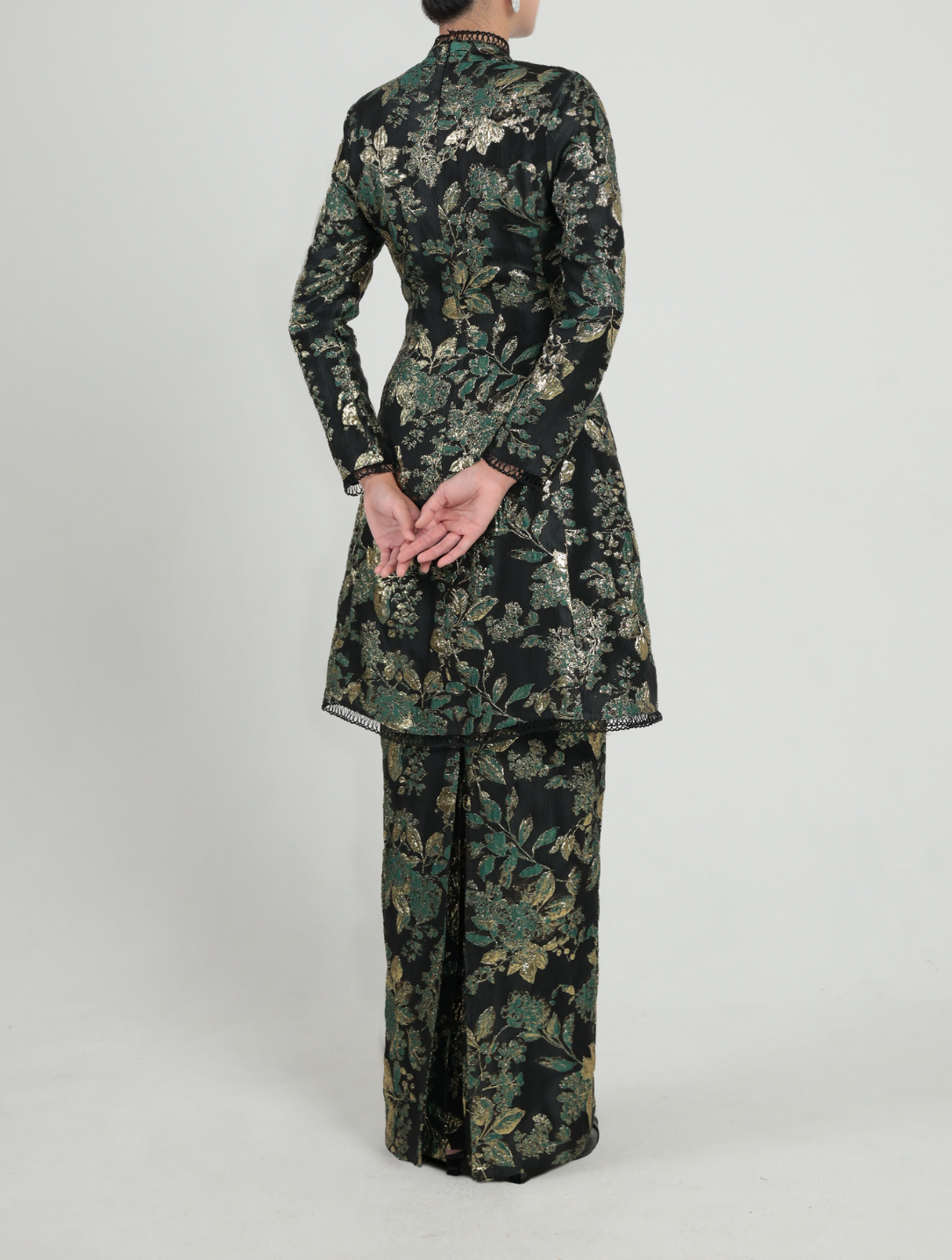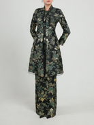 Siti, a Kutubaru long kebaya inspired design with a structured stand collar and fagotting lace accents. Designed with relaxed long sleeves, subtle shoulder padding and floral beadwork at the waist. Paired with a pencil skirt featuring a pleated back and elastic waistband. Fully lined for a polished look.