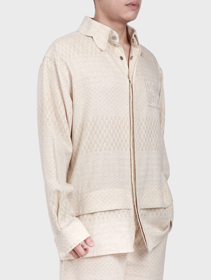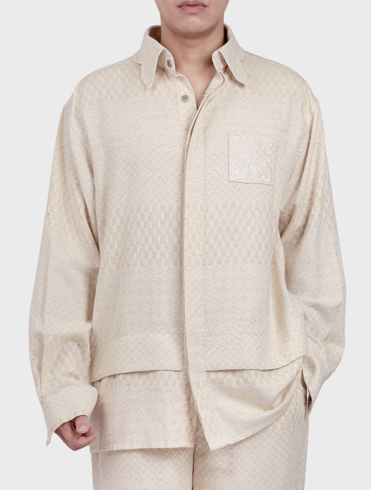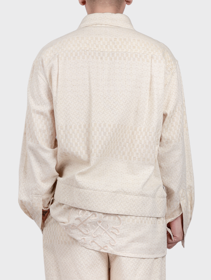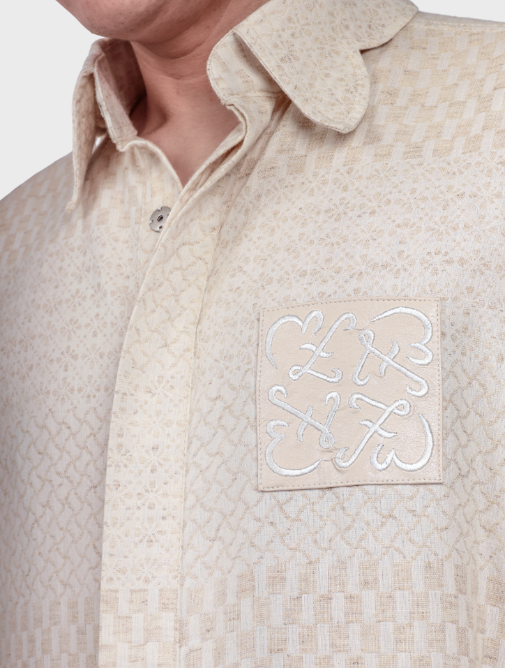 Amar in Ivory Pearl is a linen shirt with a stand collar and cuffed long sleeves. It features a modest embroidered 'FIZIWOO' logo on the front and back hems. The shirt features a hidden button front and is unlined for a light, elegant look.