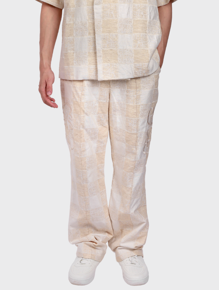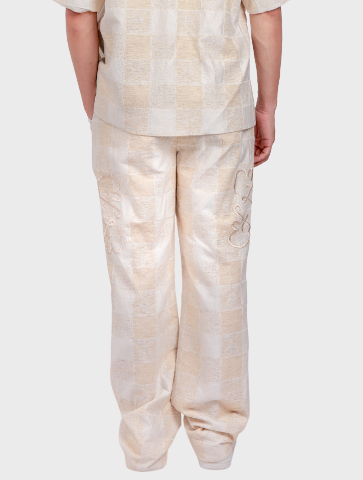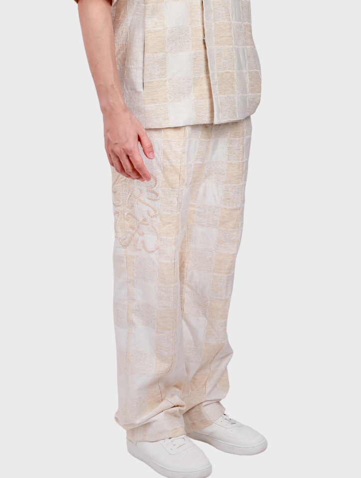 Iven in Oat Beige presents linen long pants with a straight-leg cargo style. They feature a fly zipper and button closure, front slant pockets, a concealed back pocket, and a subtle 'FIZIWOO' embroidered logo on the side. The pants are unlined for a lightweight and refined feel.