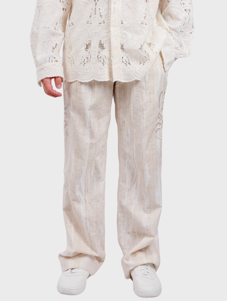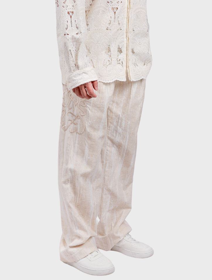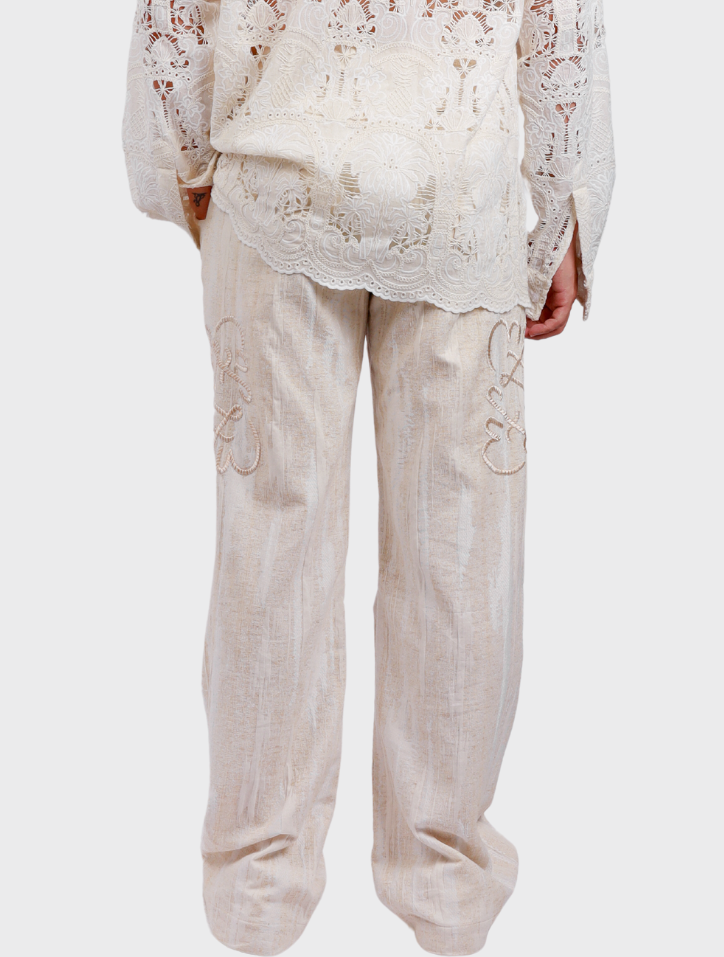 The Aziel in Oat Petal showcases a straight-leg cargo silhouette crafted from linen. It features a zip fly with button closure, angled front pockets, and a discreet rear pocket. The side displays a refined flat embroidery of the 'FIZIWOO' logo. This unlined pant offers a clean and elegant finish.