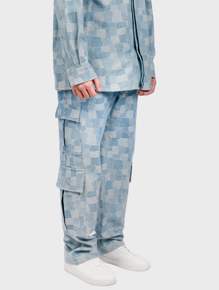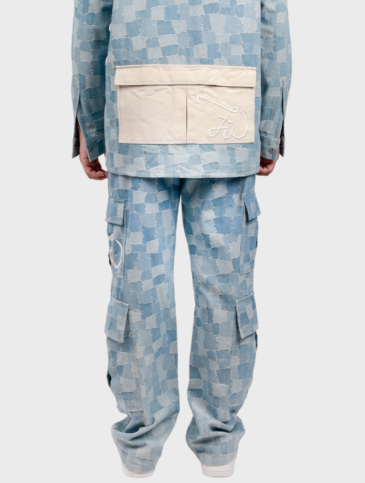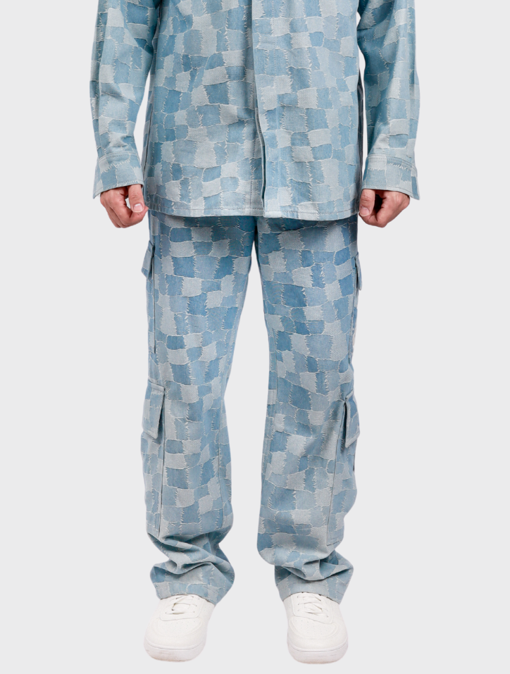 Zyrel in Denim Blue showcases straight-leg cargo pants crafted from durable denim. Featuring a zip fly with button closure, these pants include front slant pockets, back patch pockets, and cargo flap-patch pockets embroidered with 'FIZIWOO.' Reinforced knee panels enhance durability, all designed without lining for a polished, sophisticated appeal.