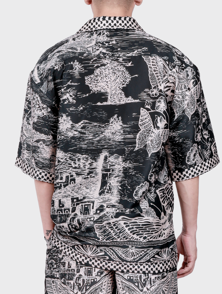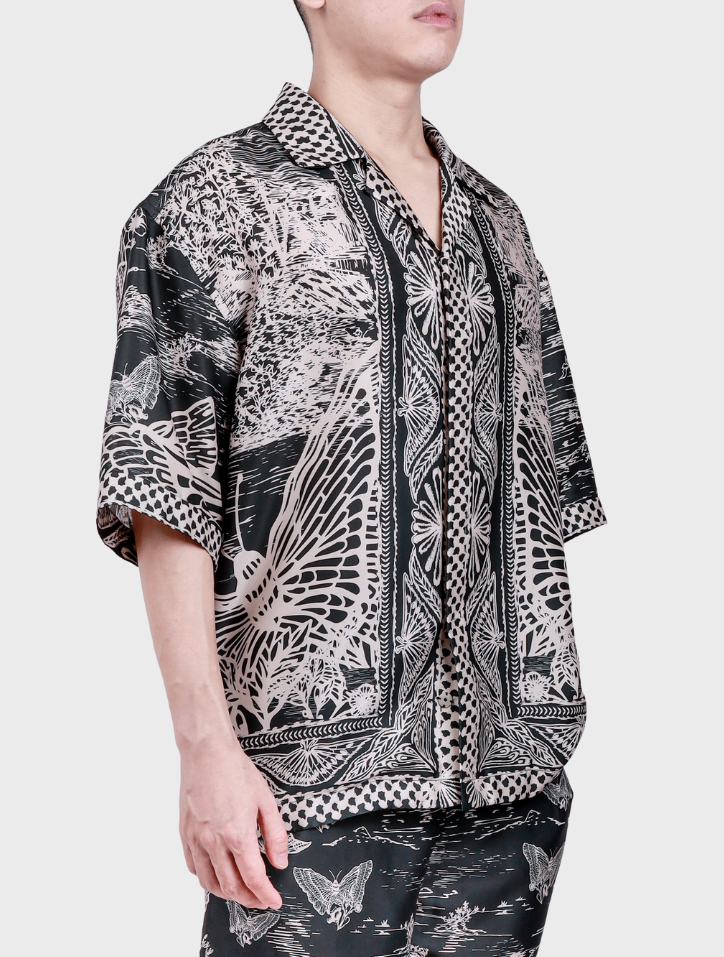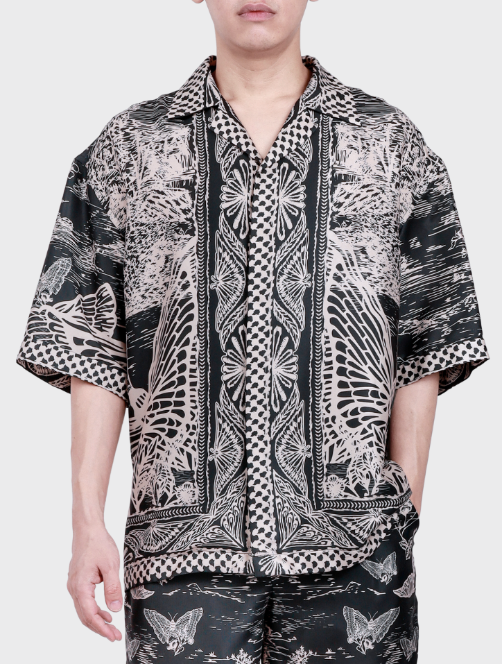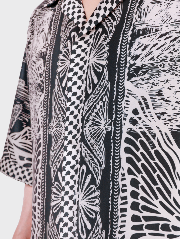 Aven in Charcoal Cream is a printed silk twill shirt top with a stand collar and short sleeves. It has a concealed button front and is made without lining for a sleek, elegant look.