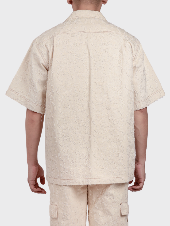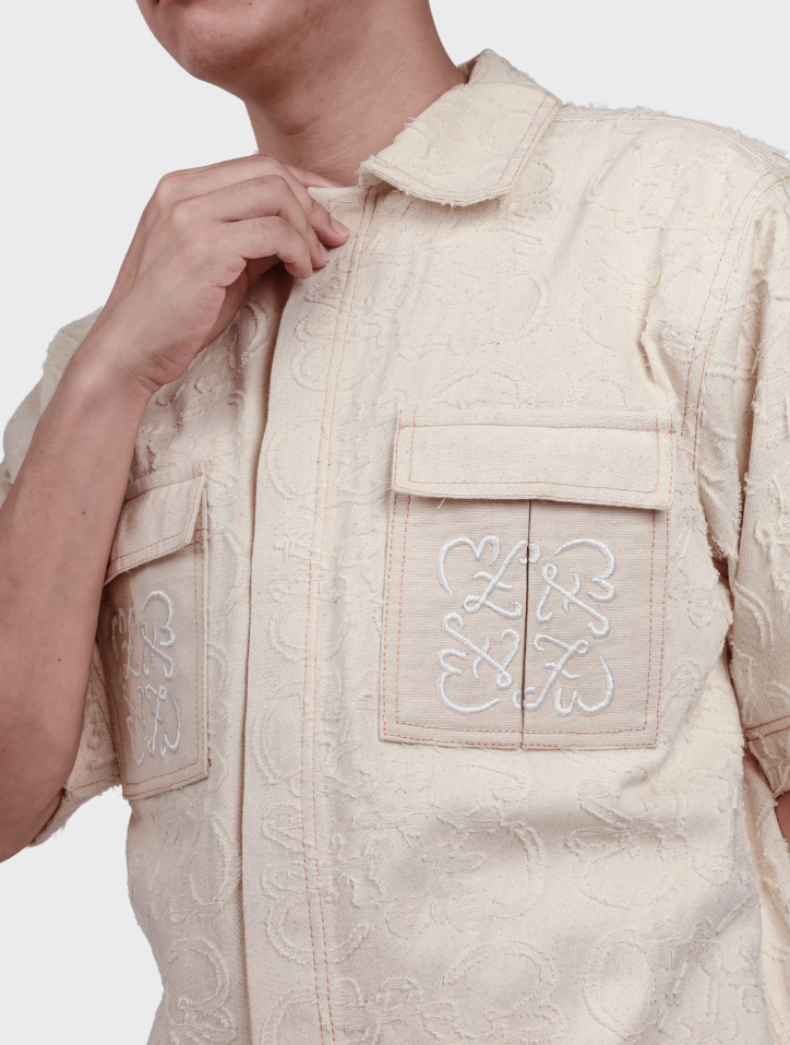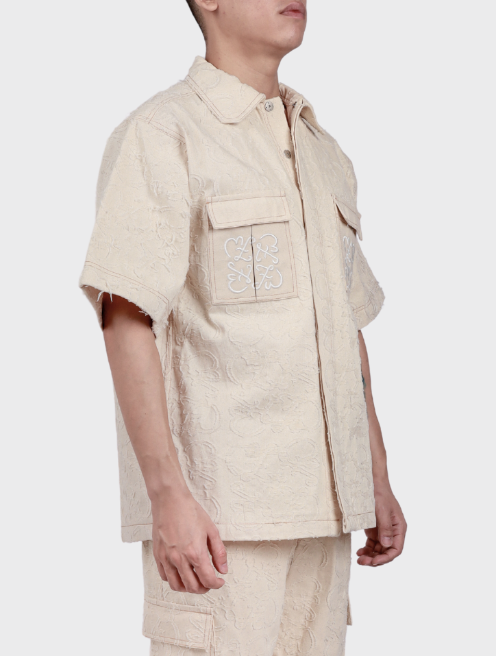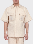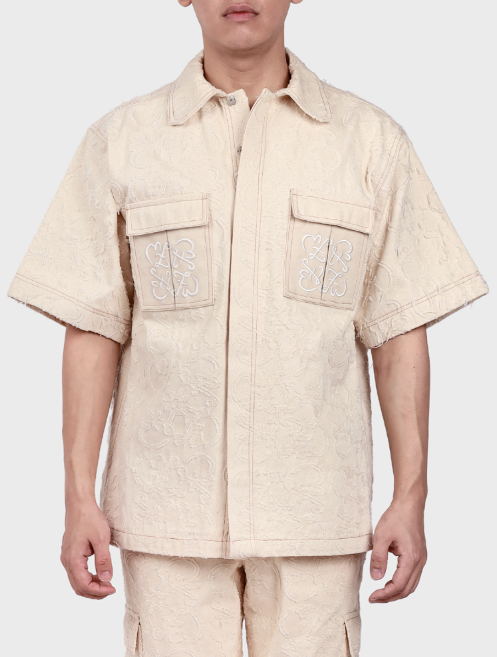 Noel in Dust Cream is a stand-collared shirt with short sleeves that has flap-patch pockets embroidered with the 'FIZIWOO' logo on both sides. It has a concealed button front opening and is unlined for a lightweight, elegant look.