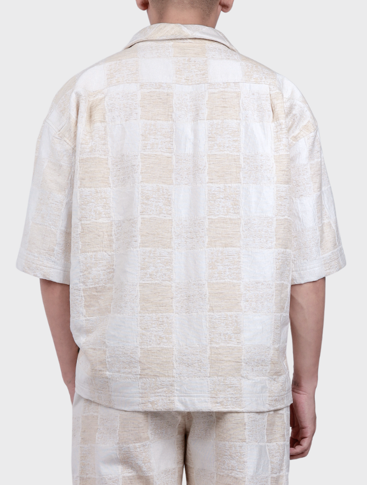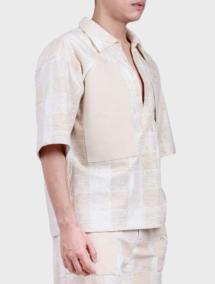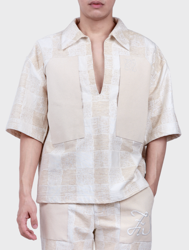 Ezra in Celestial Ivory is a linen shirt with a V-neck collar and short sleeves. It features embroidered patch pockets with the 'FIZIWOO' logo on both sides and is unlined for a lightweight, refined look.