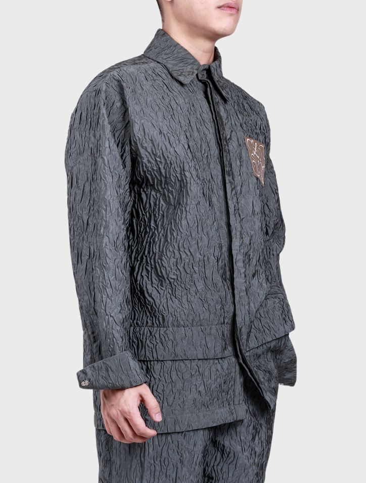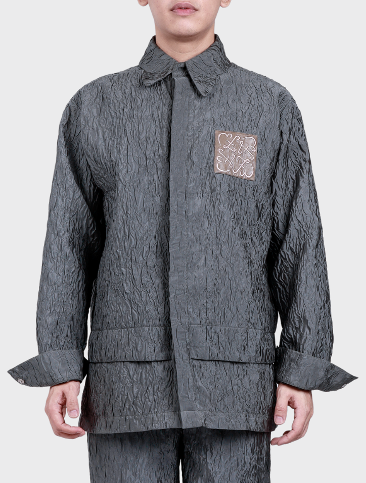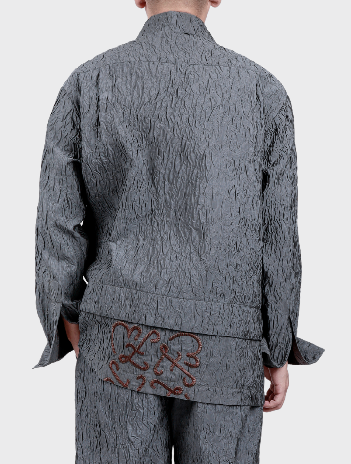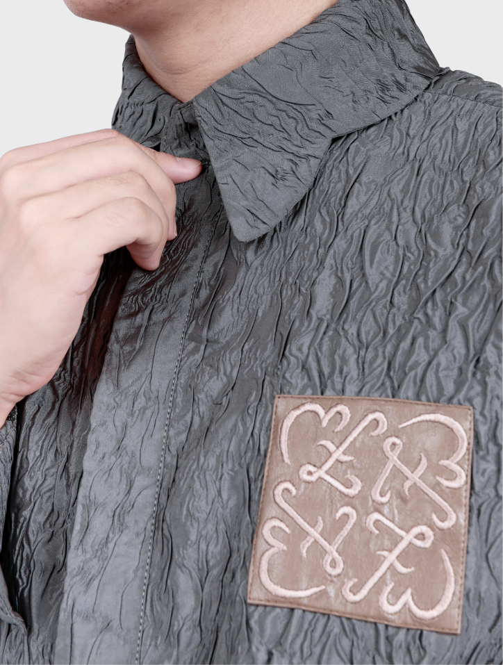 The Icaro in Moss Grey features a refined stand collar design crafted from soft jacquard fabric. This elegant shirt includes long sleeves with cuffs, a discreetly embroidered flap-patch pocket branded with 'FIZIWOO' on the left side, and a concealed button front closure. Unlined for a lightweight feel, it exudes understated sophistication.