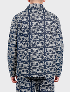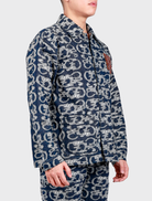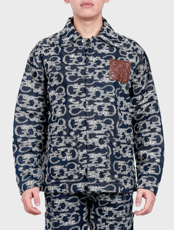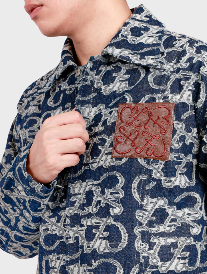 The Orel in Navy Blue is a denim shirt featuring a stand collar design. It includes long sleeves with cuffs, a flap-patch pocket on the left side adorned with leather embroidery showcasing the 'FIZIWOO' logo, and a hidden button front closure. This unlined piece offers a refined and effortless style.