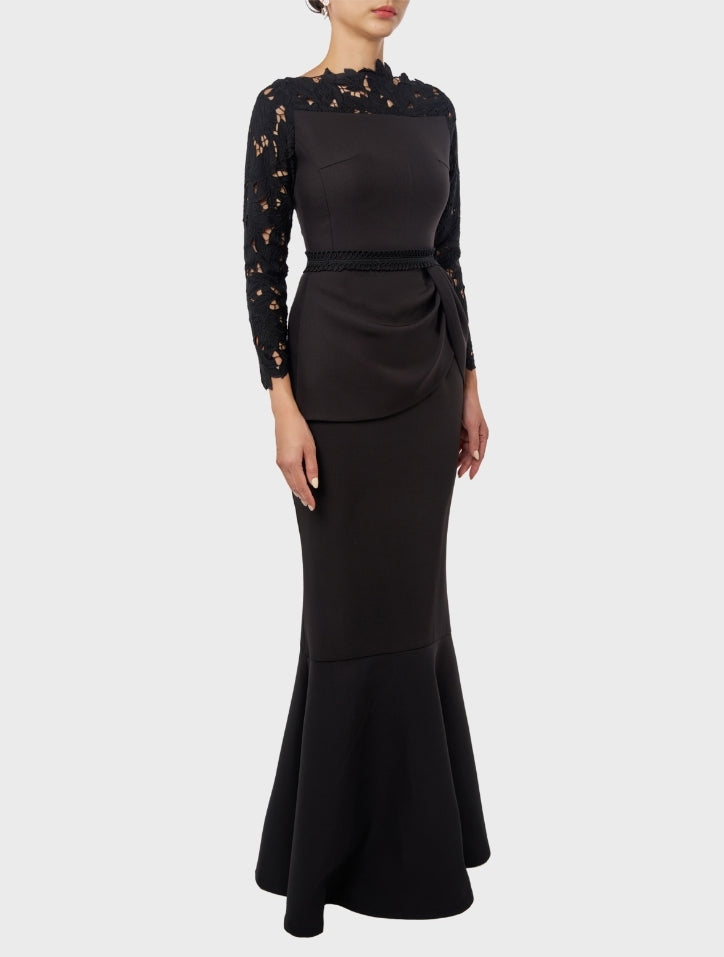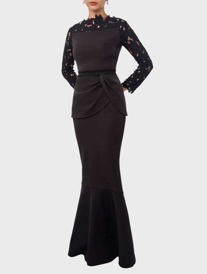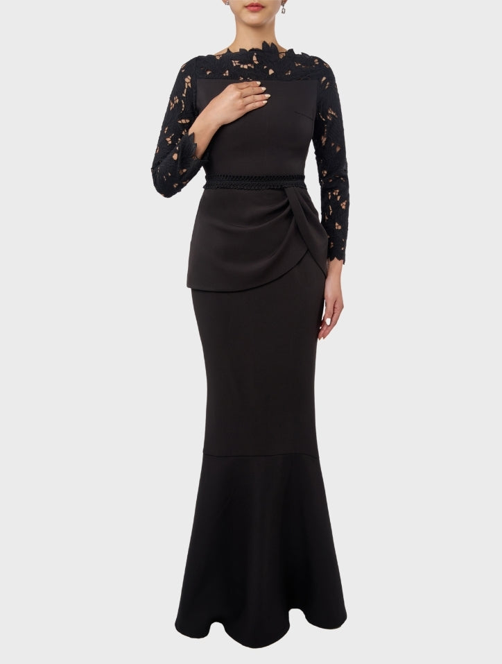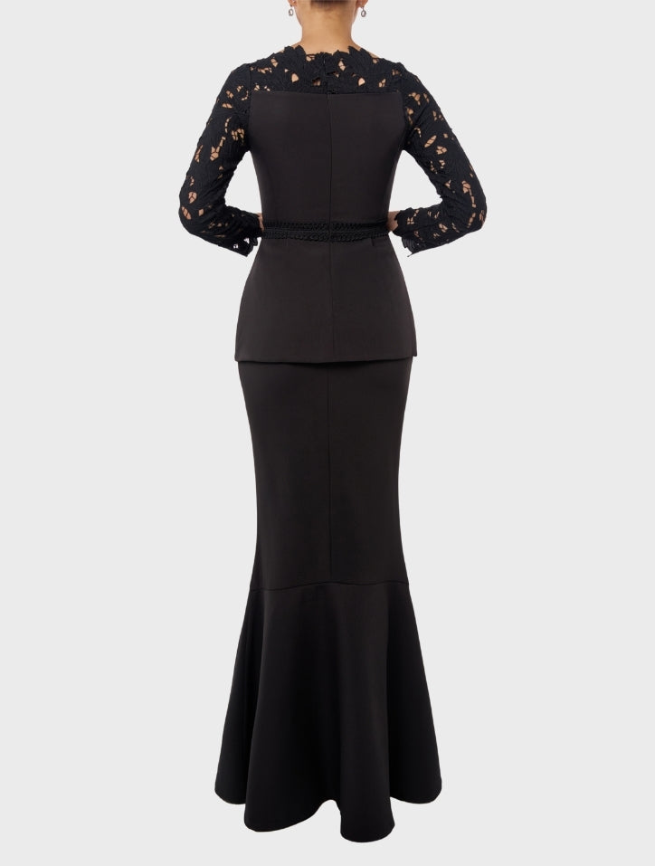 Syazwani i Black is elegant and sophisticated, featuring a boat neckline with fagotting lace at the waist and full embroidery lace on the upper bust and sleeves. An overlapping draped peplum and intricate lace trimming enhance its graceful flow, while a mermaid-cut skirt creates a sleek, feminine silhouette. Unlined and finished with a hidden back zip and hook fastening, it offers lightweight, seamless wear.