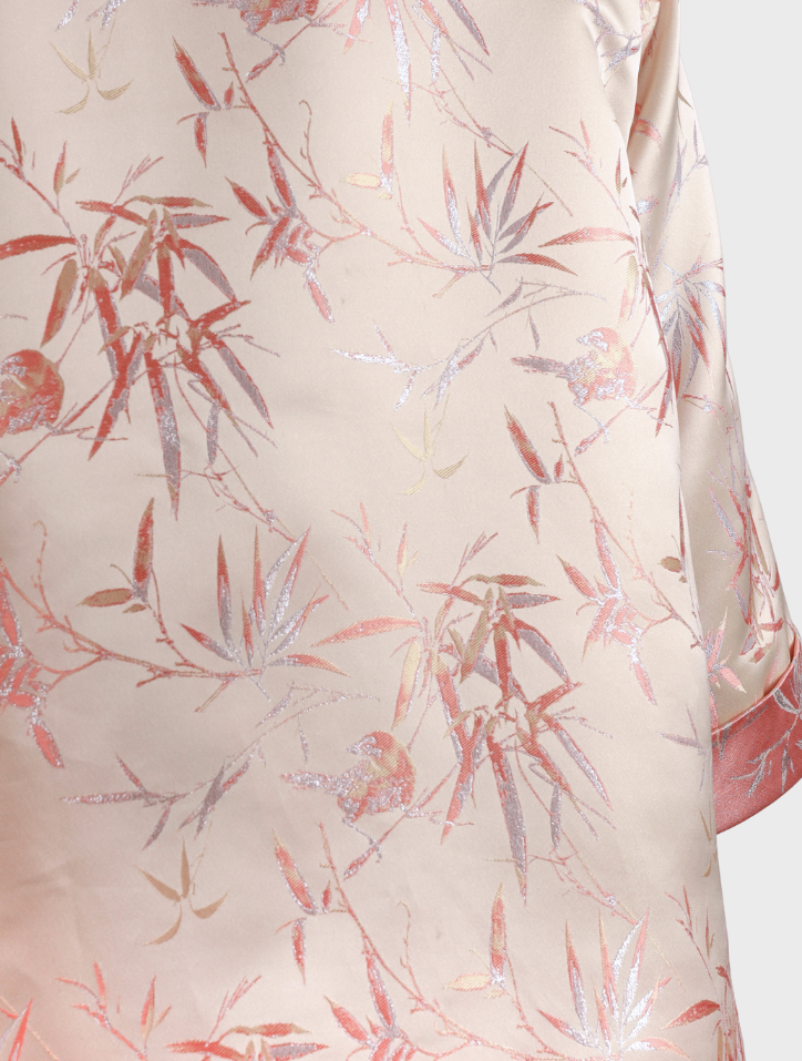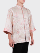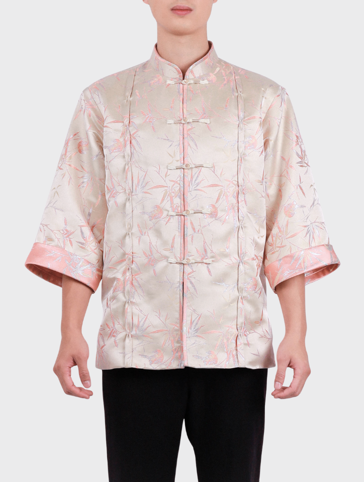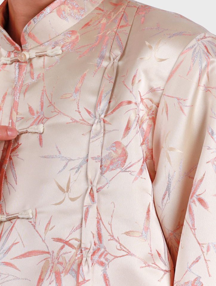 Tian Bao in Beige is crafted from refined jacquard fabric in a soft beige hue. It features a Mandarin collar with piping, a front opening with a Chinese frog fastener, and elegant box pintuck detailing. The 3/4 sleeves are designed with folded panels, while the interior is fully lined with smooth silk satin and structured with shoulder pads for a clean, polished finish. *Note: Actual color may vary slightly due to lighting and screen settings.*