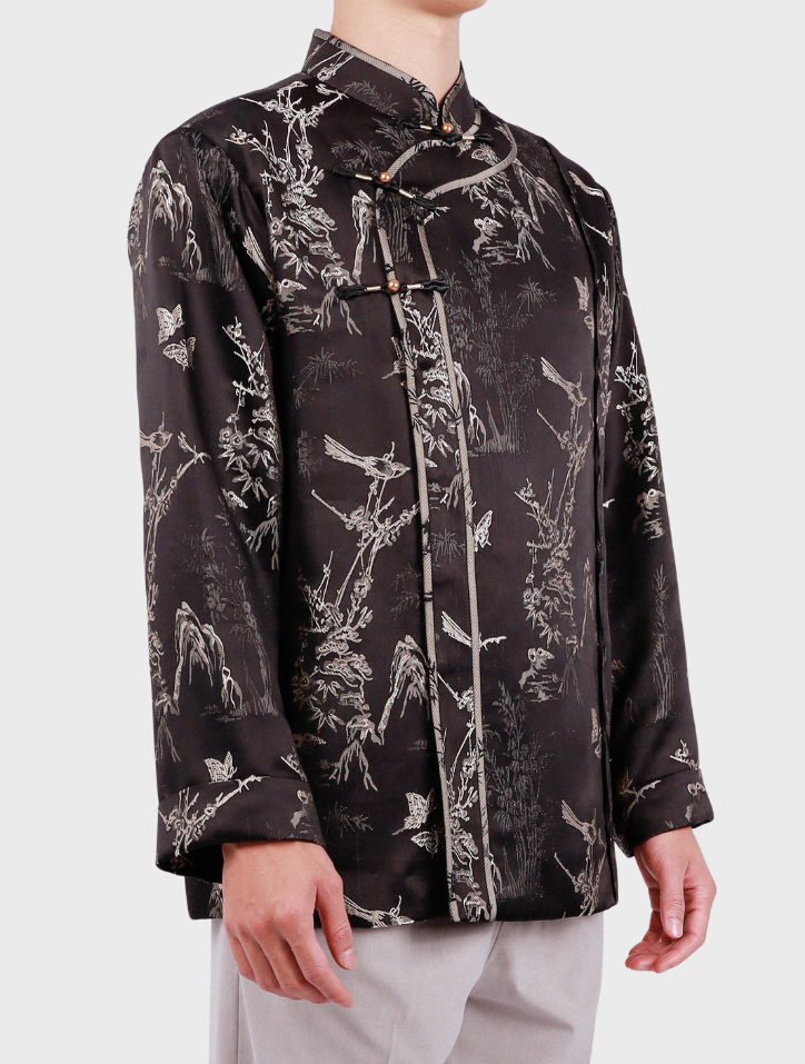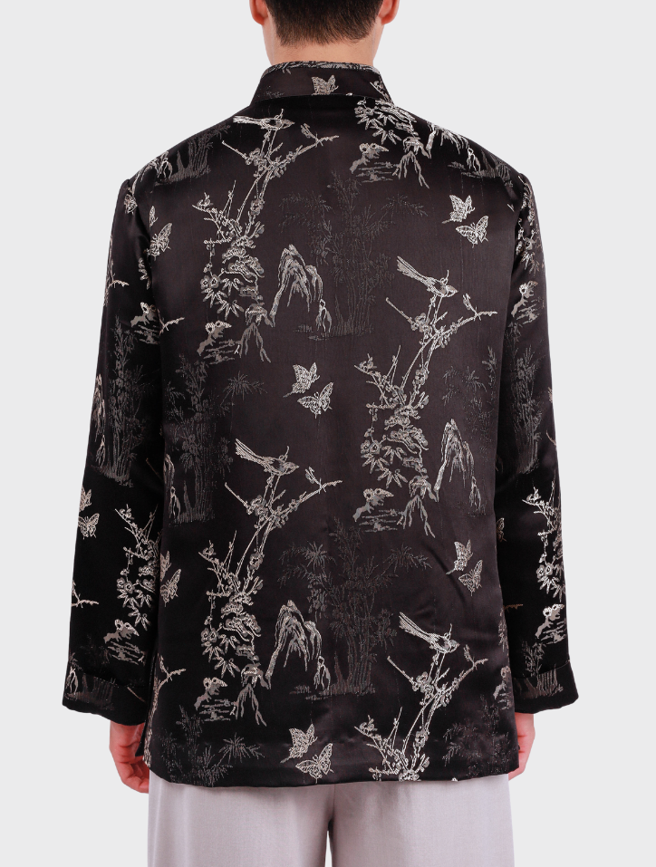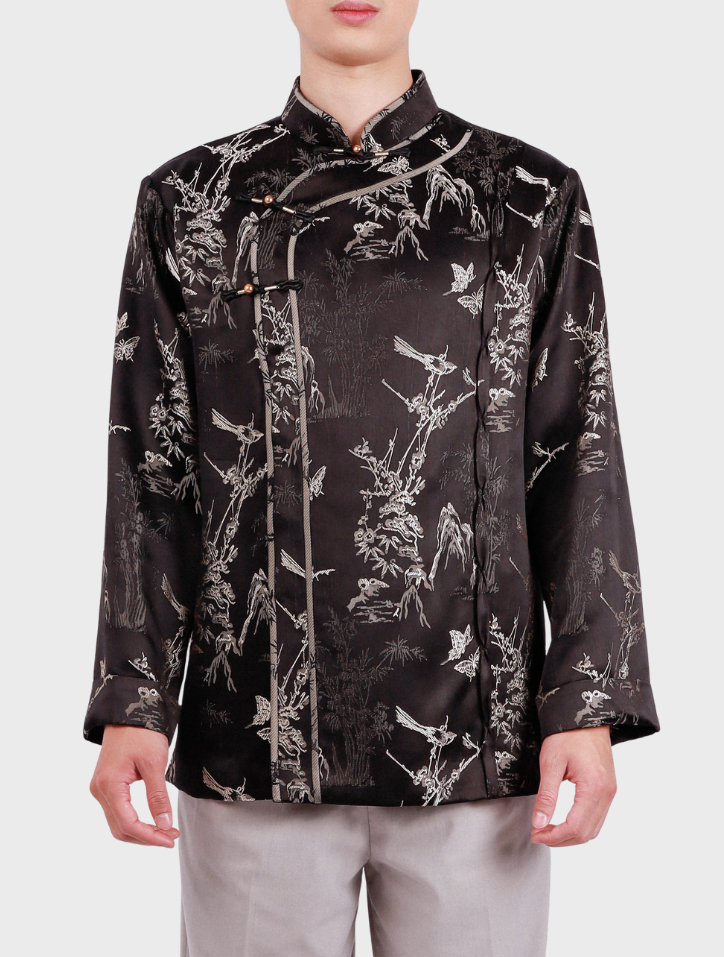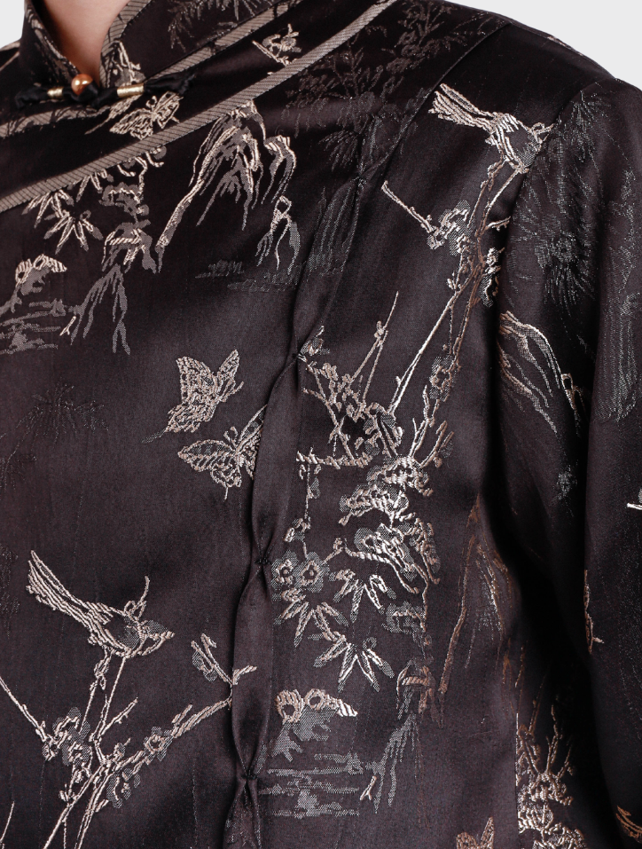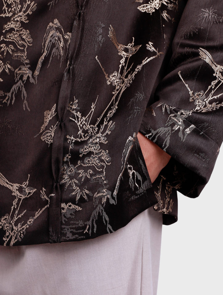 Tian Jun in Black is made from rich jacquard fabric, giving it a structured and elegant finish. The detailing includes refined piping and a traditional Chinese frog fastener for a touch of heritage. Inside, it is fully lined with smooth satin silk, adding comfort and a luxurious feel to the design. The piece comes in a timeless black hue.