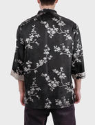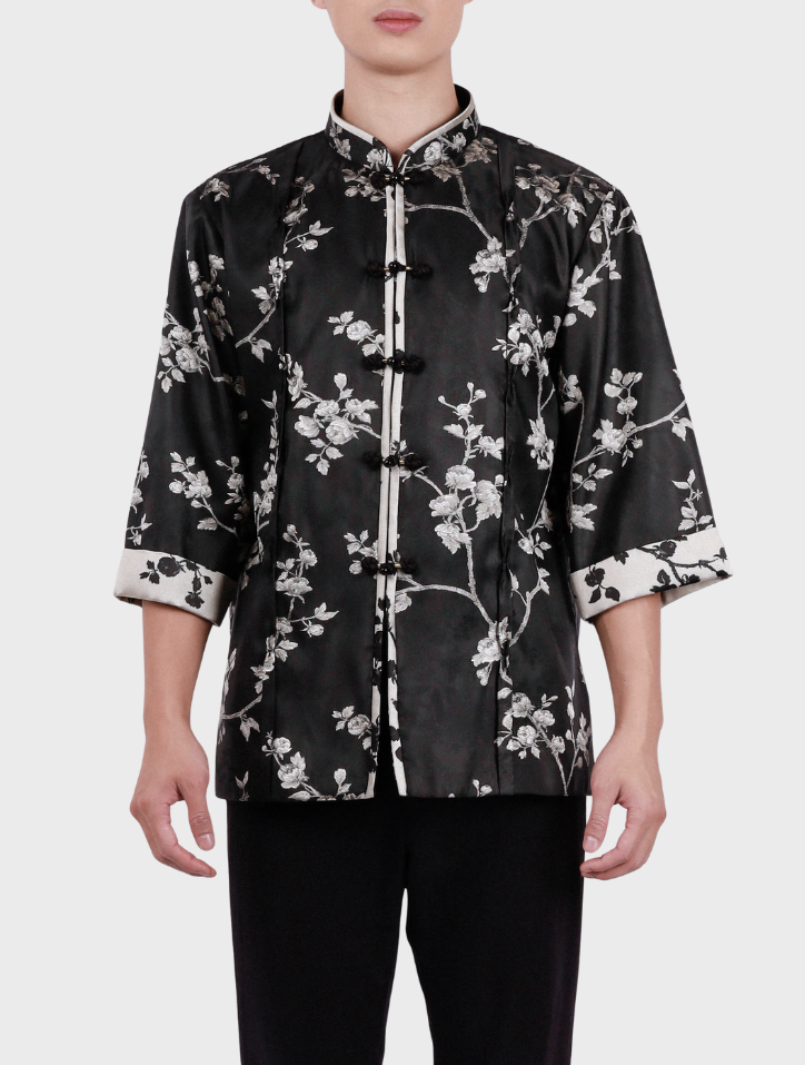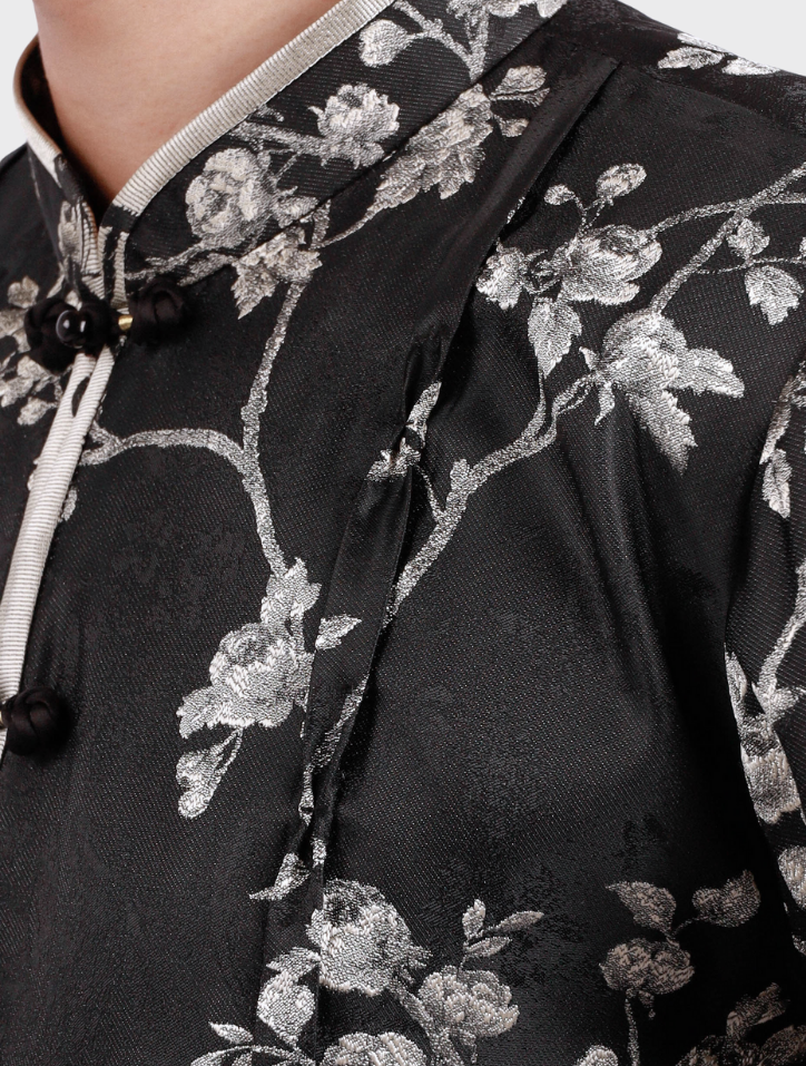 Tian Bao in Black is crafted from refined jacquard fabric in classic black. It features a Mandarin collar with piping, a front opening with a Chinese frog fastener, and box pintuck detailing. The 3/4 sleeves are finished with folded panels, while the interior is fully lined with smooth silk satin and structured with shoulder pads.