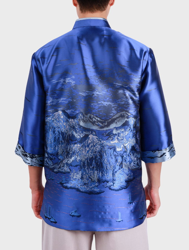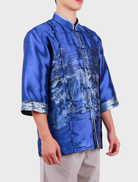 Tian Bao in Royal Blue is crafted from elegant jacquard fabric in a rich royal blue hue. It features a Mandarin collar with piping, a front opening with a Chinese frog fastener, and refined box pintuck detailing. The 3/4 sleeves are finished with folded panels, while the interior is fully lined with smooth silk satin and structured with shoulder pads for a polished silhouette. *Note: Actual color may vary slightly due to lighting and screen settings.*