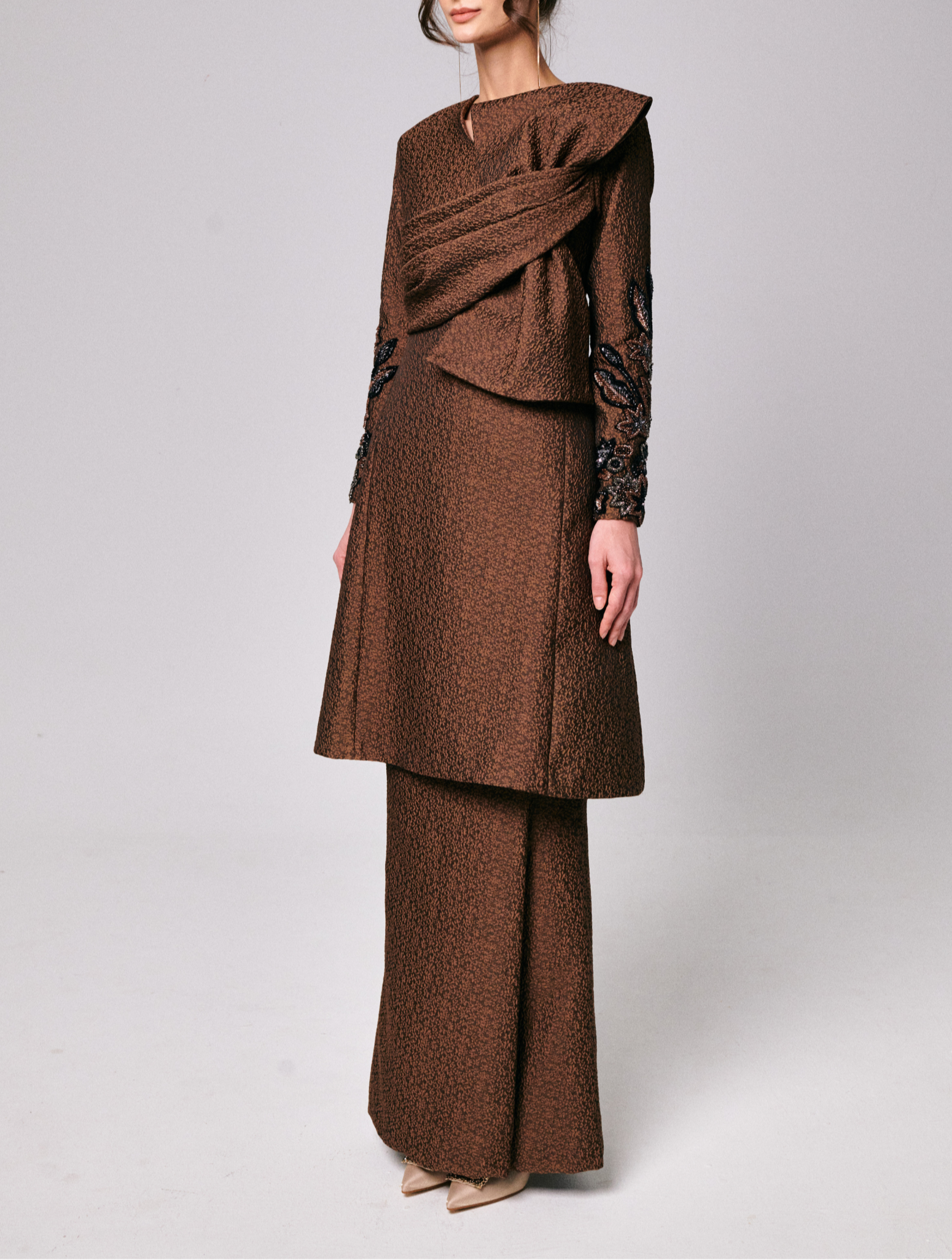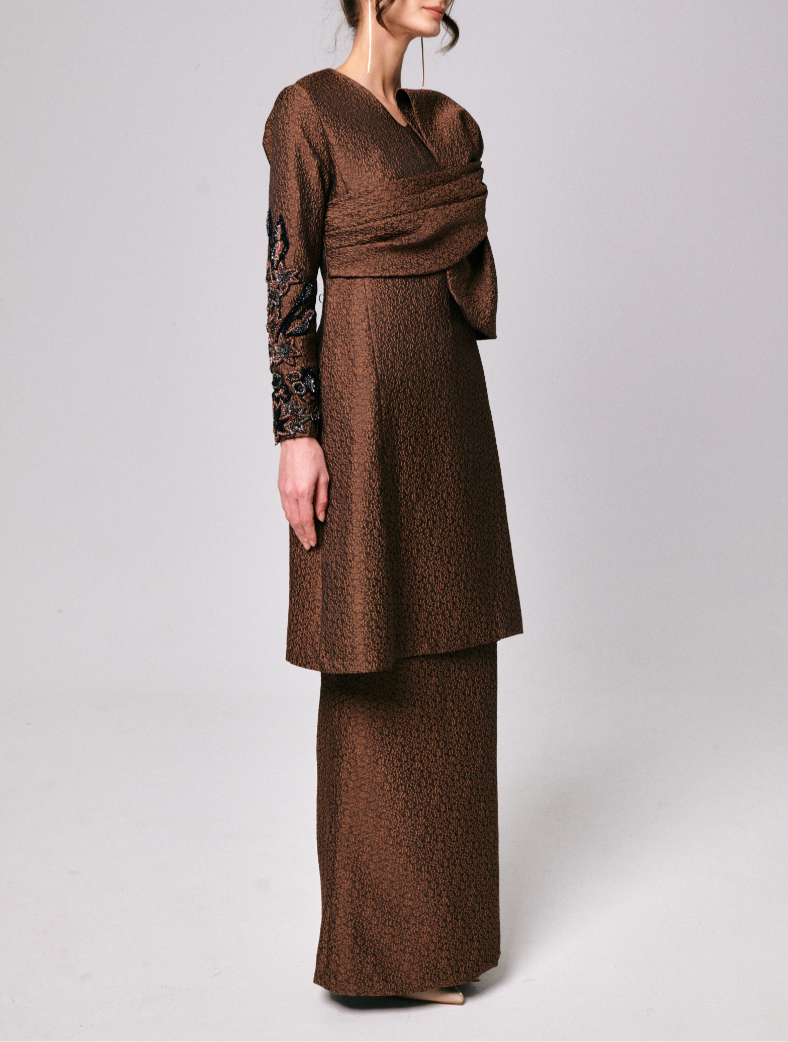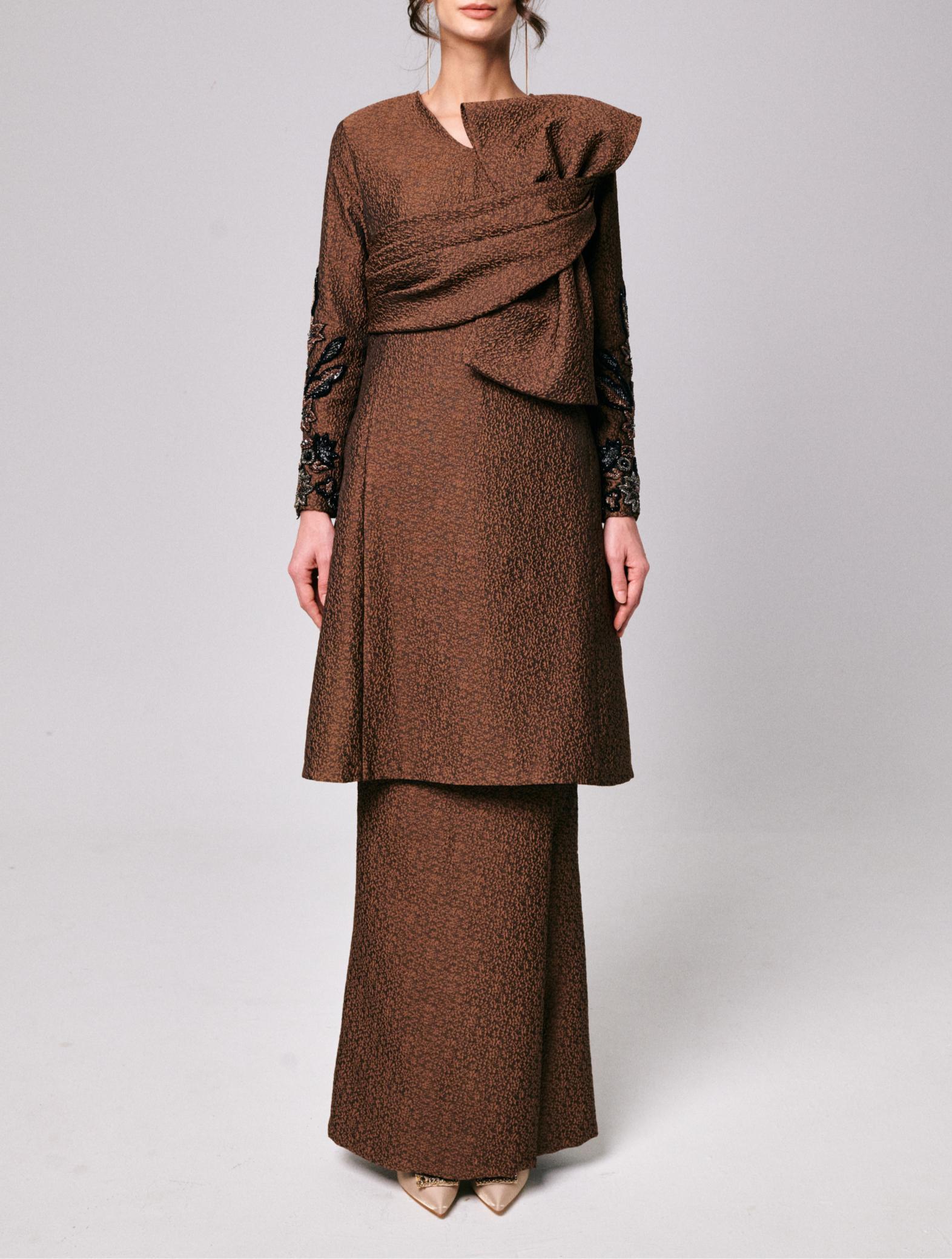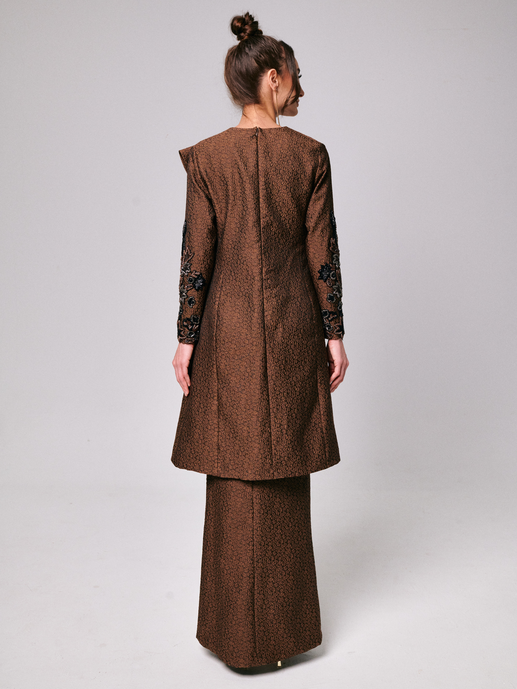 Tini in Brown Sugar is crafted from a soft blend jacquard, giving it a smooth and elegant finish. The neckline and sleeves are accented with delicate hand-tamboured beadwork for a refined touch. The matching front fold skirt is made from the same jacquard fabric, fully lined, and finished in a rich Brown Sugar shade.