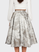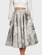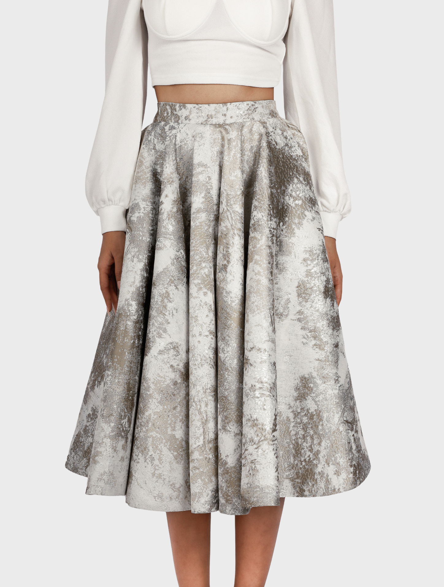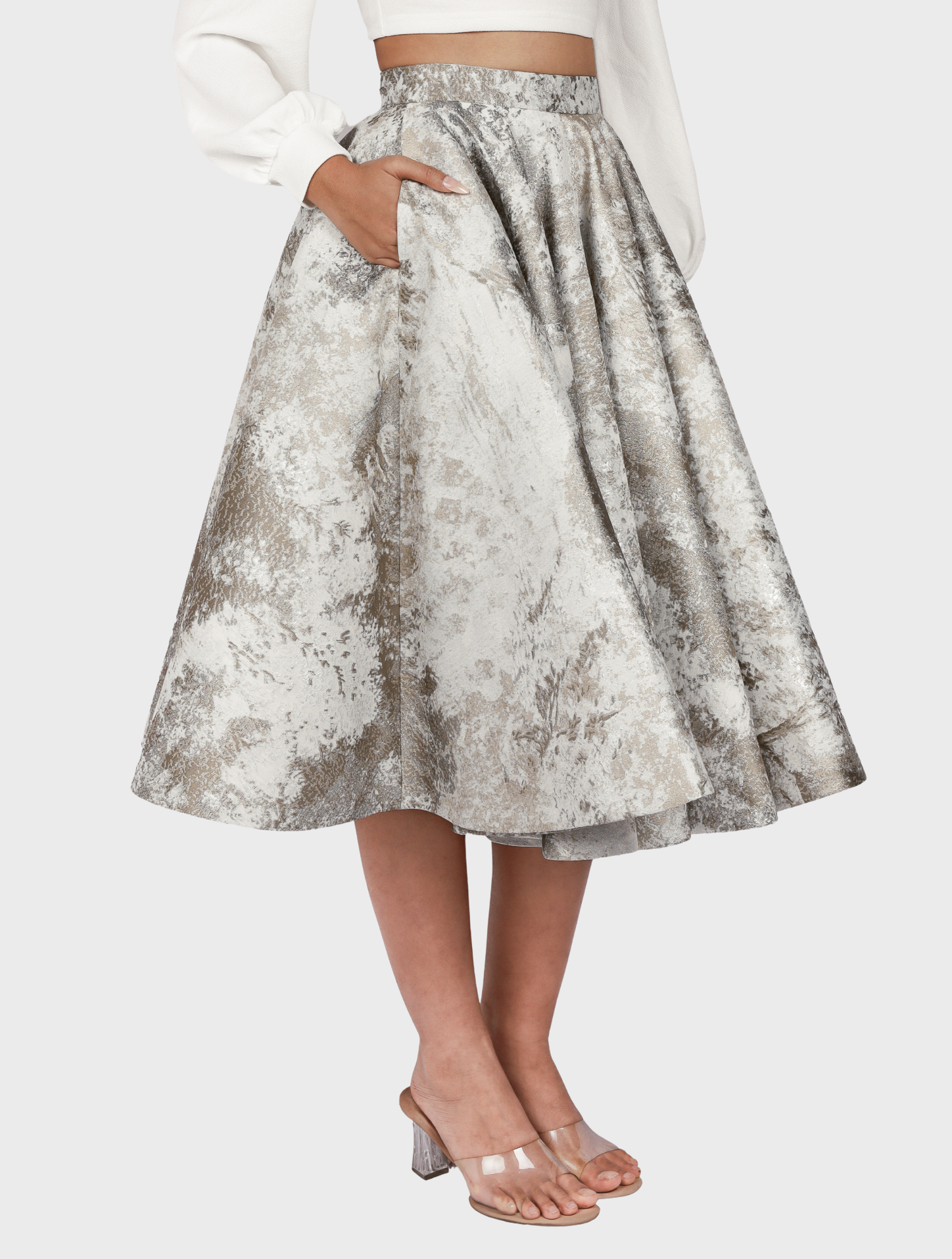 Tuileries Mini in White Beige is crafted from high-quality jacquard fabric with a subtle textured pattern. It features a circular silhouette, side pockets, and a back slit for both style and functionality. A concealed zipper completes this elegant, non-stretchable piece.
