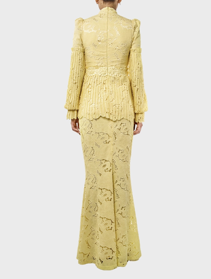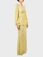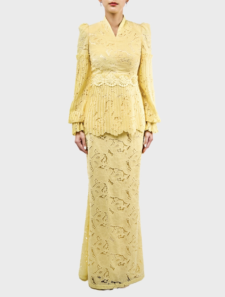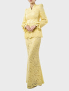 Ummi in Pastel Yellow is graceful and refined, featuring a V-neckline with full embroidery lace and fagotting lace at the waist. A pleated peplum and voluminous balloon sleeves add structure and elegance, while a slim mermaid-cut skirt completes the feminine silhouette. Lined with silky satin and finished with a hidden back zip and hook fastening, it offers a seamless, luxurious fit.