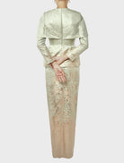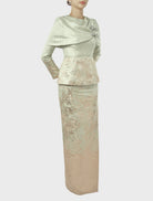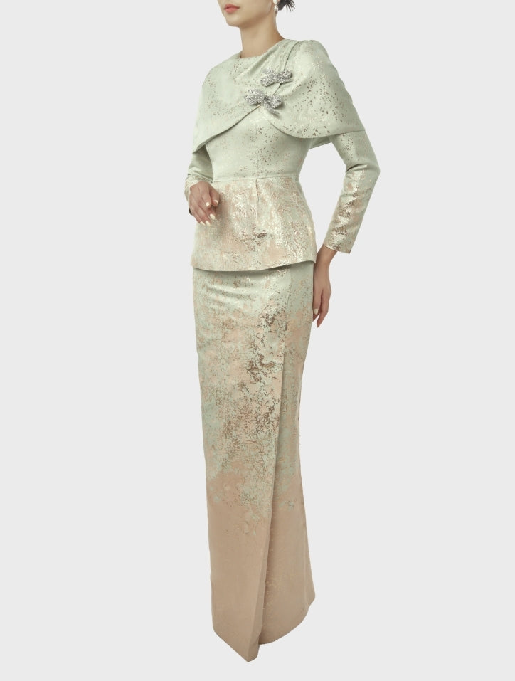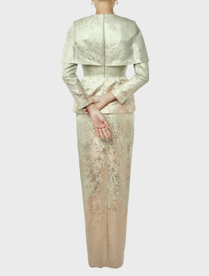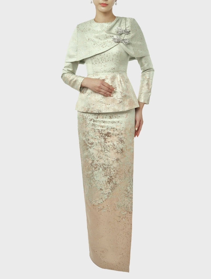 Wennie in Coral Mint is elegant and sophisticated, featuring a round neckline with a draped cape and a delicate beaded bow embellishment. A structured peplum enhances the silhouette, while long sleeves add refined elegance. Paired with a side-pleated pencil-cut skirt and lined with silky satin, it is finished with a hidden back zip and hook fastening for effortless, luxurious wear.