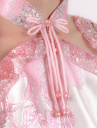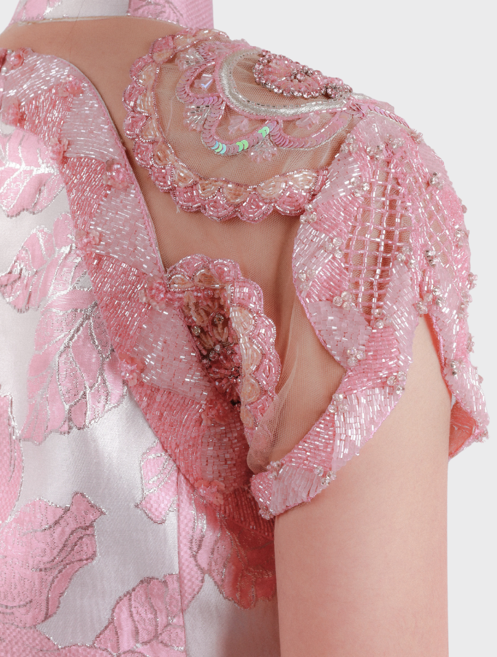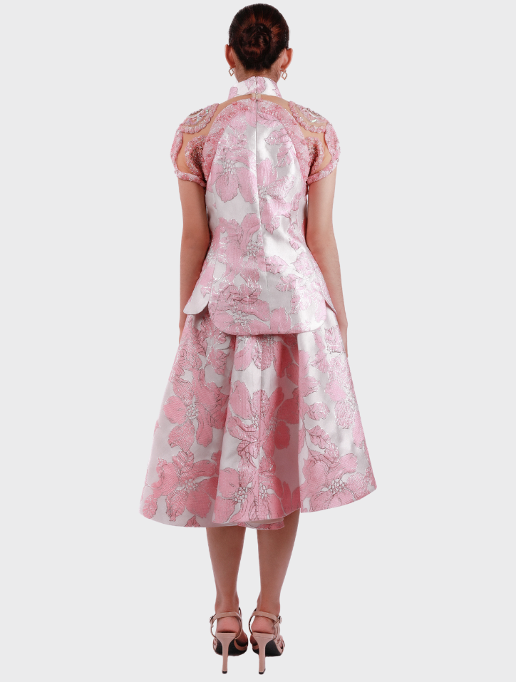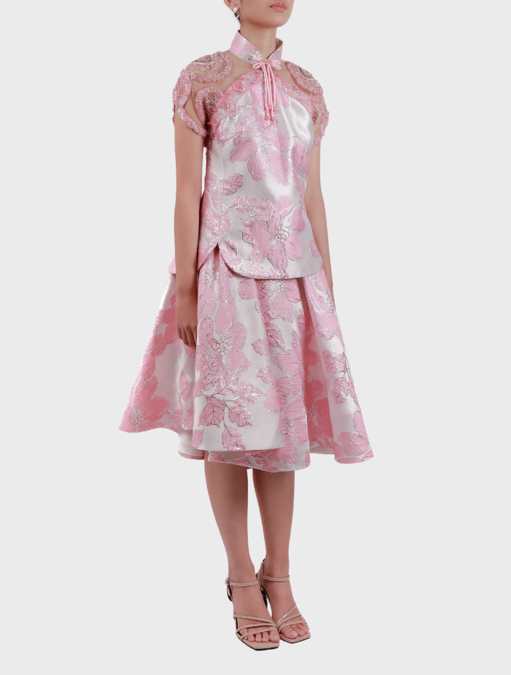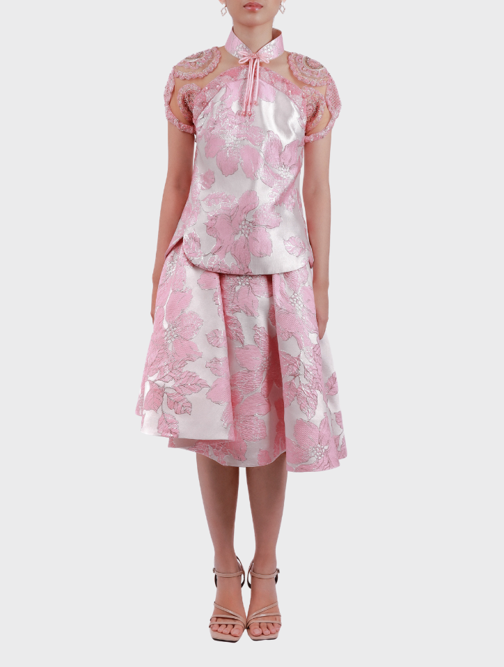 Xia Yu in Pink is crafted from elegant jacquard fabric in a soft pink hue. The top features a Mandarin collar, frog fastening, full beaded cap sleeves, and a silky satin lining for a smooth finish. The asymmetrical knee-length skirt is designed with an elastic waistband, side pockets, and a satin lining, complete with a hidden back zip for a clean look.