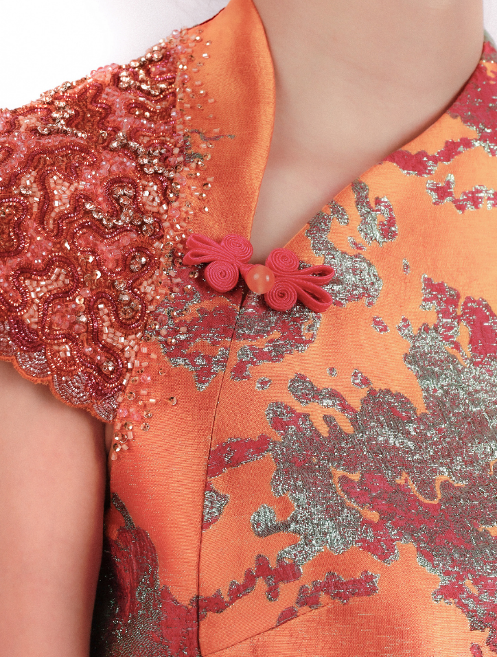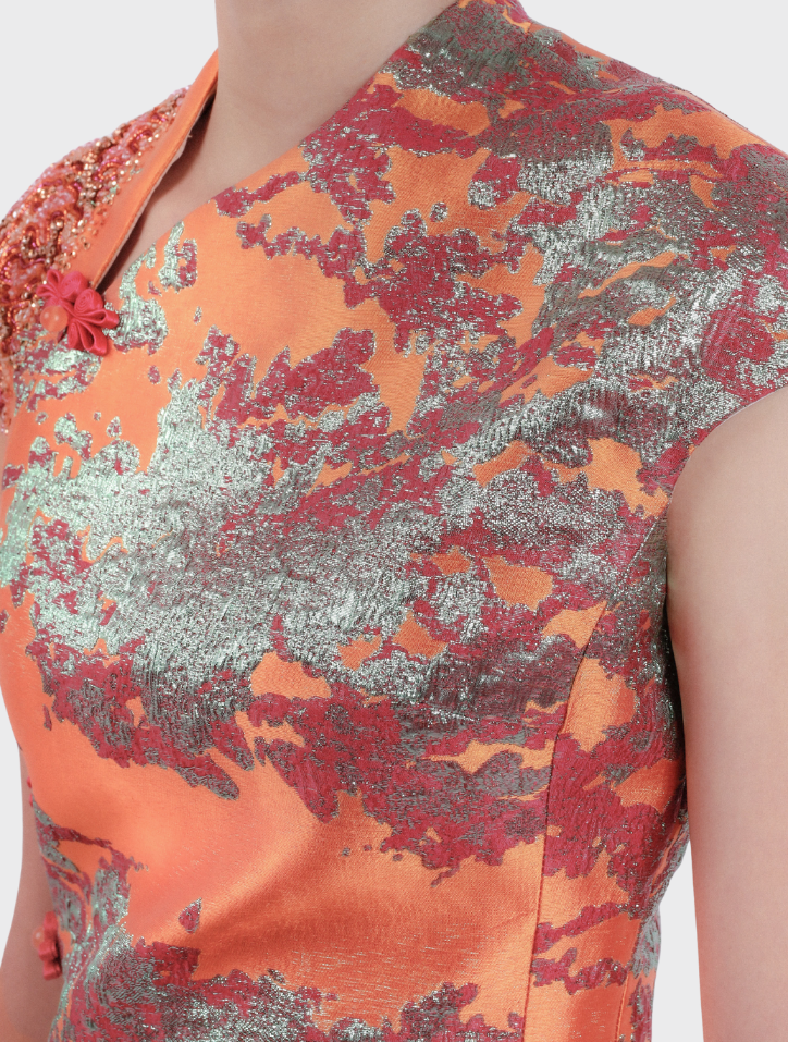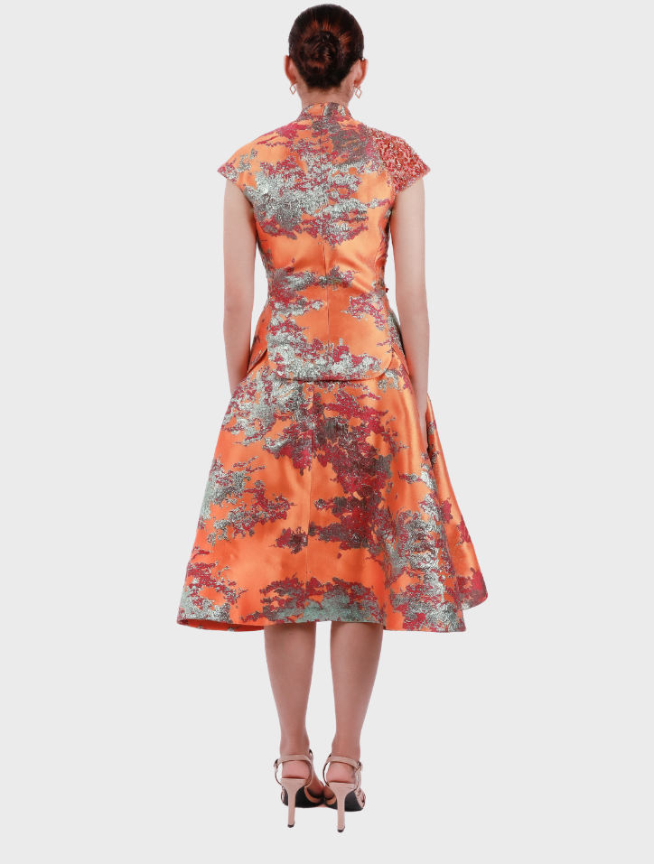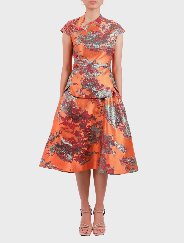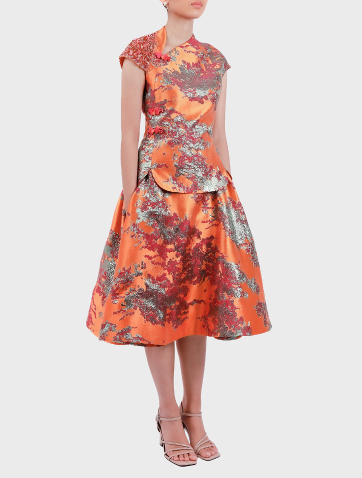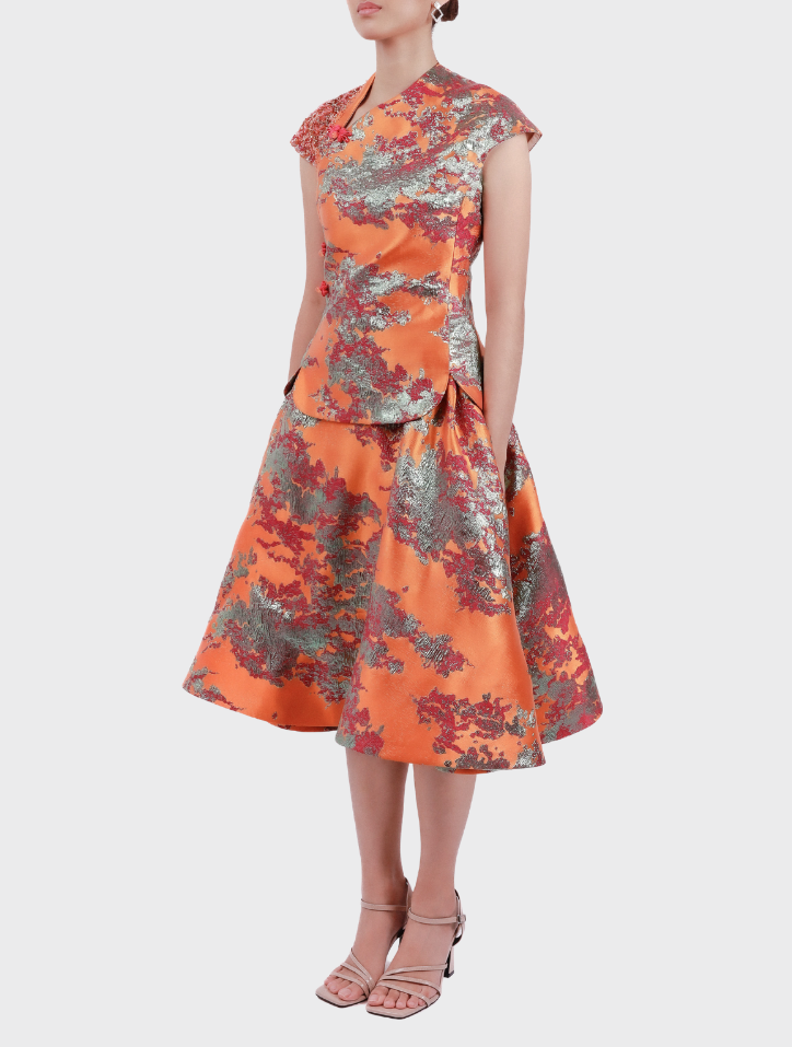 Yi Cheng in Orange is crafted from rich jacquard fabric, blending traditional detailing with a modern touch. The top features an asymmetrical neckline with a frog fastening, beaded cap sleeves, and a smooth satin lining. It pairs with a circular knee-length skirt designed with an elastic waistband, side pockets, and hidden closures, all in a bold orange hue.