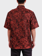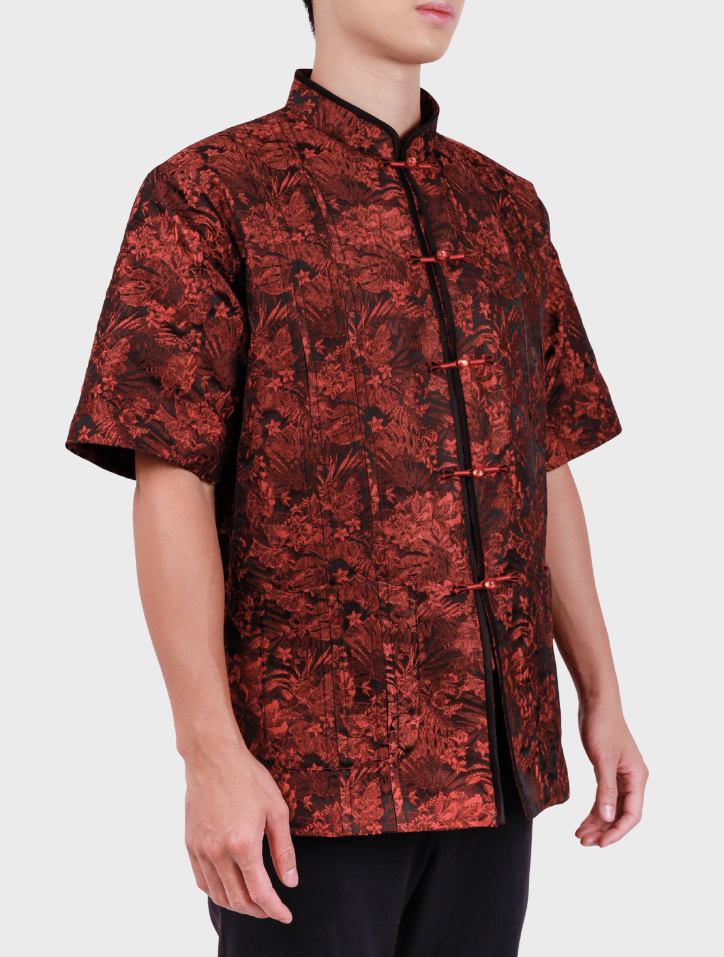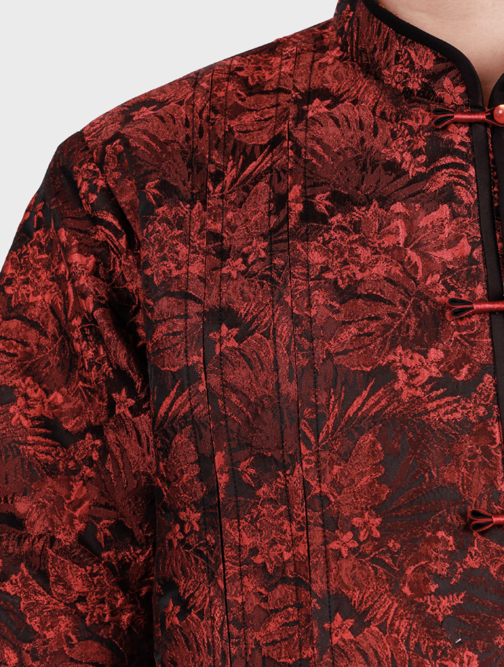 Yi Ge in Black Red is crafted from elegant jacquard fabric in a striking black red hue. It features a Mandarin collar with piping, a front opening with a Chinese frog fastener, and refined box pleat detailing with a patch pocket at the front. The interior is fully lined with smooth silk satin and structured with shoulder pads for a sleek, polished finish.