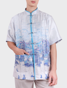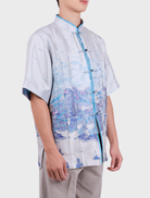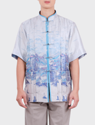 Yi Ge in Sea Blue is crafted from elegant jacquard fabric in a serene sea blue hue. It features a Mandarin collar with piping, a front opening with a Chinese frog fastener, and refined box pleat detailing with a patch pocket at the front. The interior is fully lined with smooth silk satin and structured with shoulder pads for a polished finish.