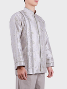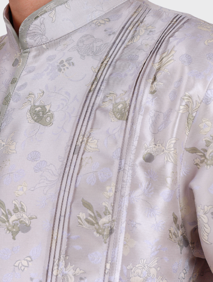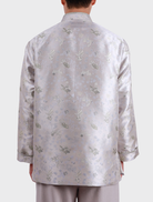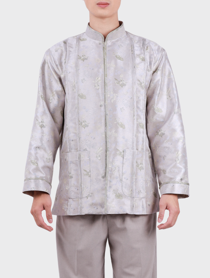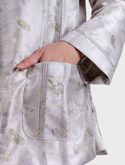 Yuan Bao in Grey is crafted from refined jacquard fabric in a classic grey hue. It features a Mandarin collar with piping, a front opening with matching piping and fastening, and delicate pintuck detailing with a patch pocket at the front. The long sleeves are designed with folded panels and piping accents, while the interior is fully lined with silk satin and structured with shoulder pads for a polished finish.