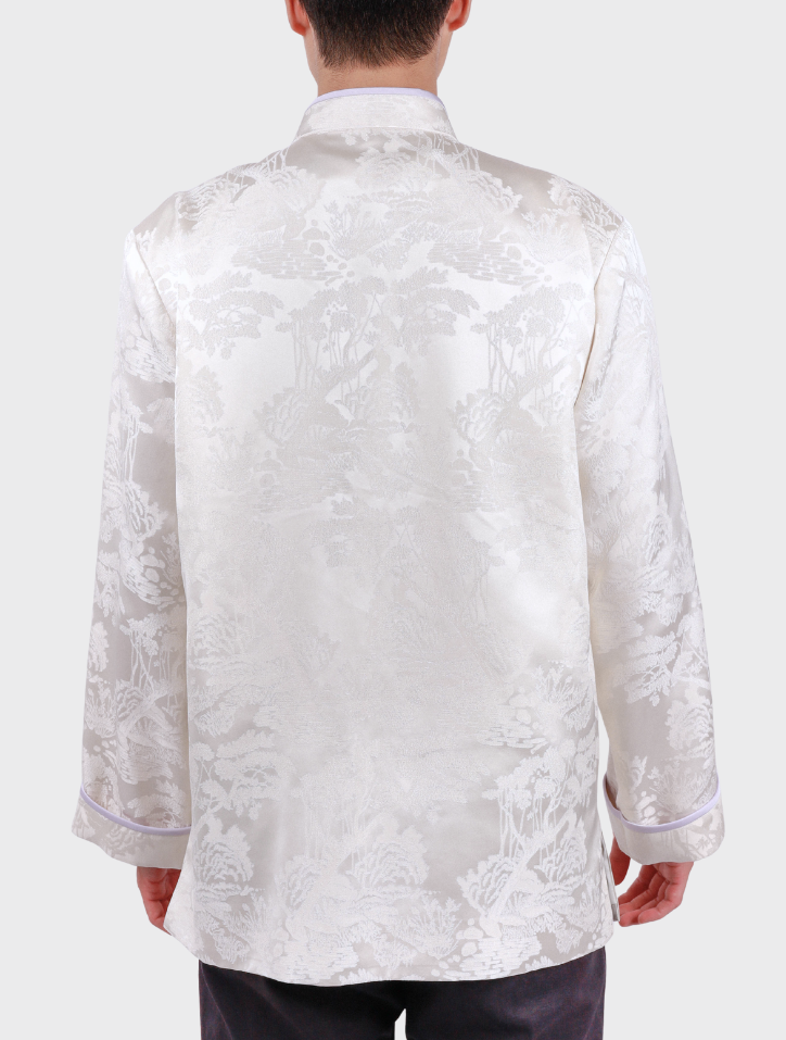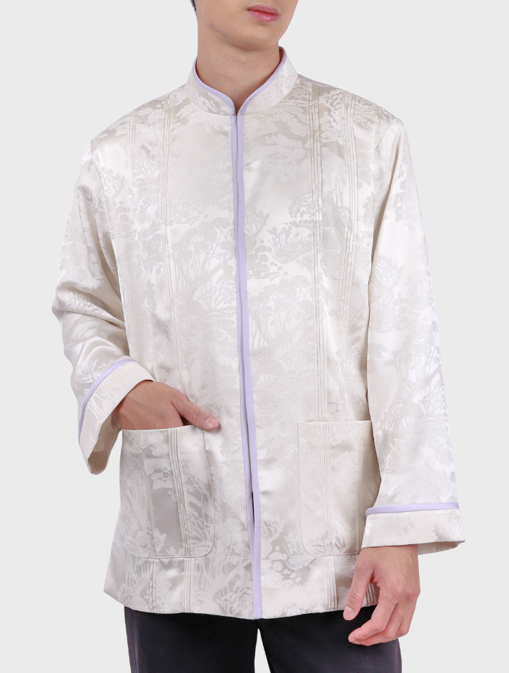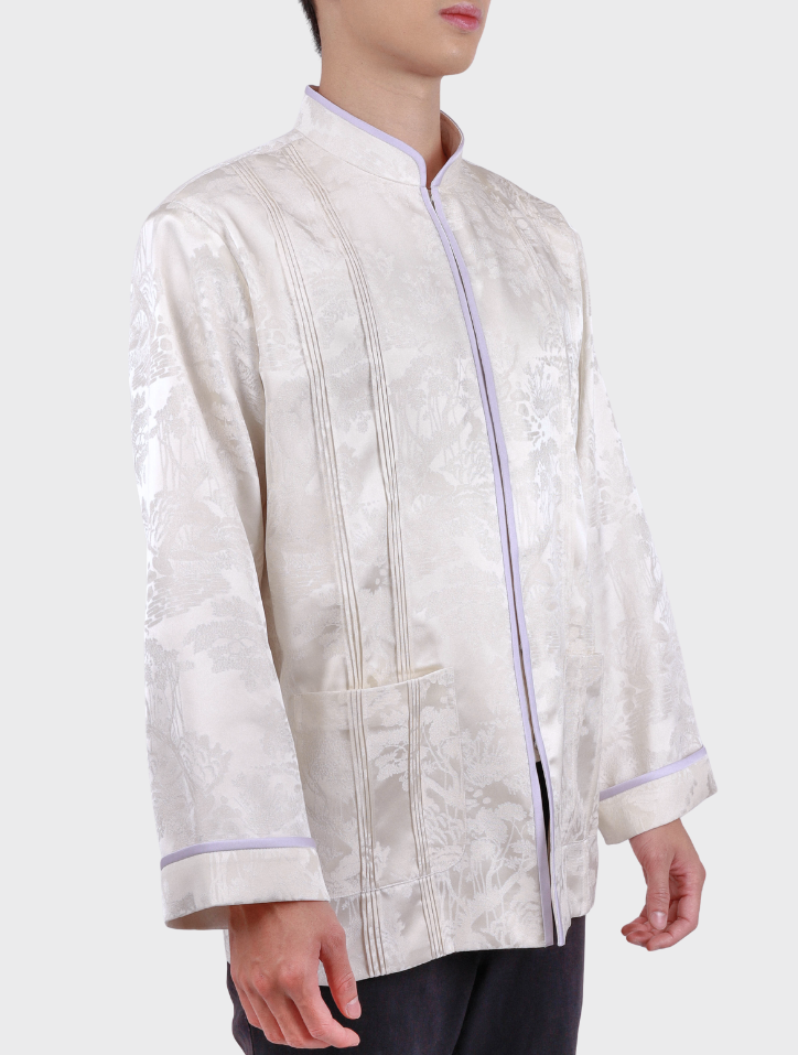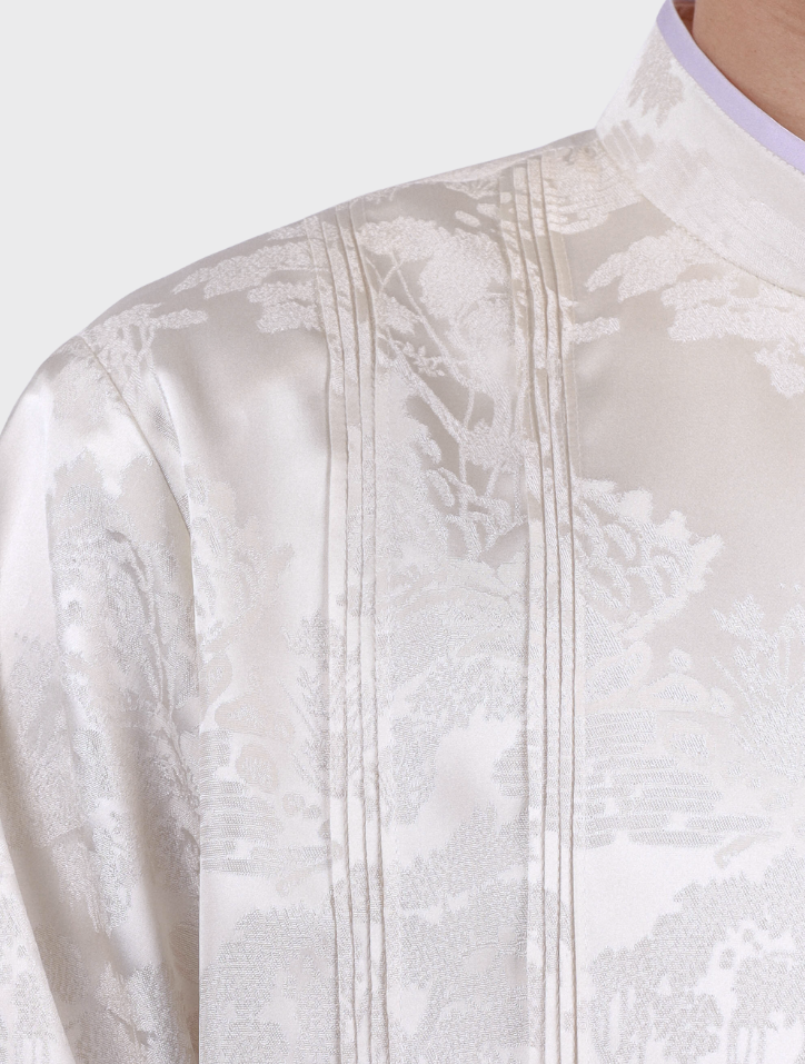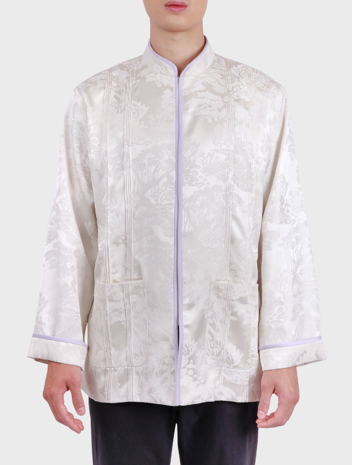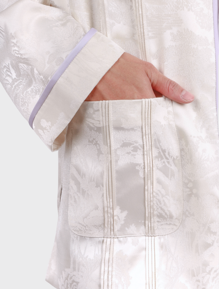 Yuan Bao in White Purple is made from refined jacquard fabric in a soft white purple shade. It features a Mandarin collar with piping, a front closure with matching piping, and subtle pintuck detailing. A practical patch pocket and long sleeves with folded panels and piping accents add structure, while the interior is lined with smooth silk satin and structured with shoulder pads for a clean, elegant finish.