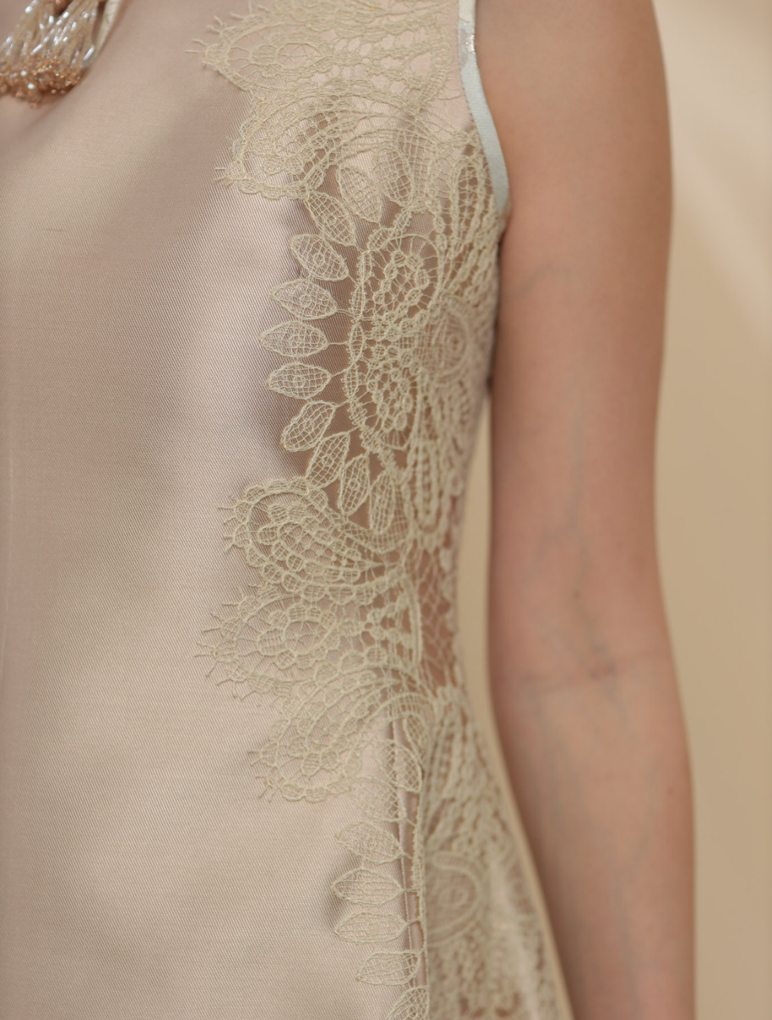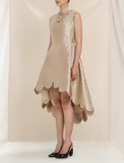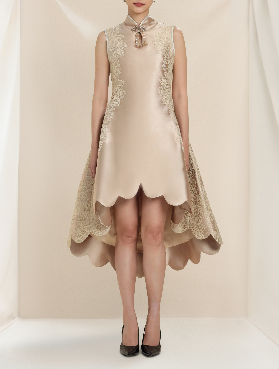 The Yuen stands out with a sleeveless built-up collar, piping finishes, and frog-button tassel accents along the front. Designed in a graceful high-low silhouette with lace patching on both sides and a scalloped hemline, it offers a refined, airy movement, fully lined in satin.