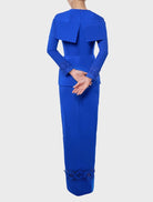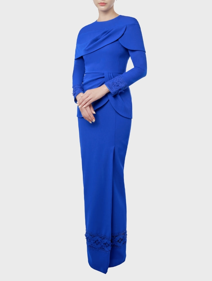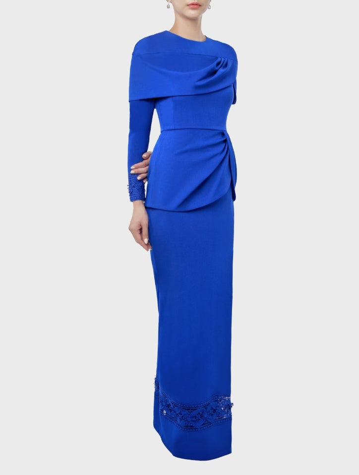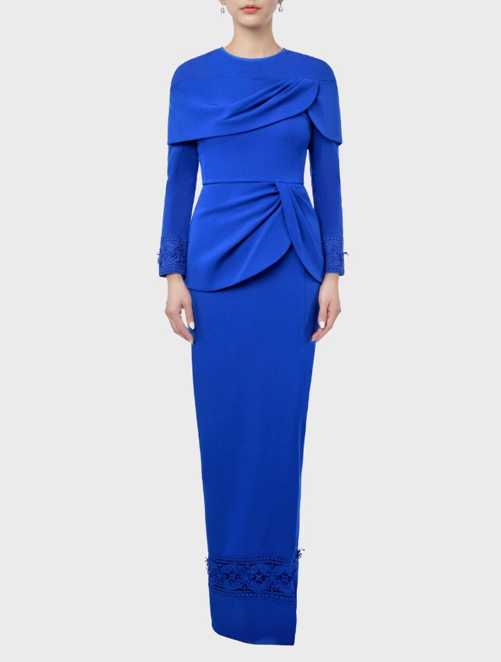 Zaihani in Royal Blue is graceful and refined, featuring a round neckline with a draped cape detail. The overlap drape peplum creates a flattering silhouette, while long sleeves with delicate fagotting lace add subtle intricacy. Finished with a hidden back zip and hook fastening, it offers a polished, effortless look.