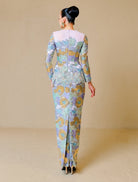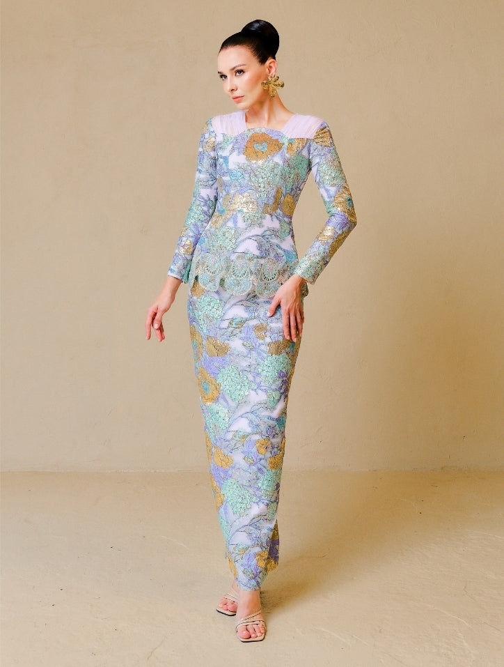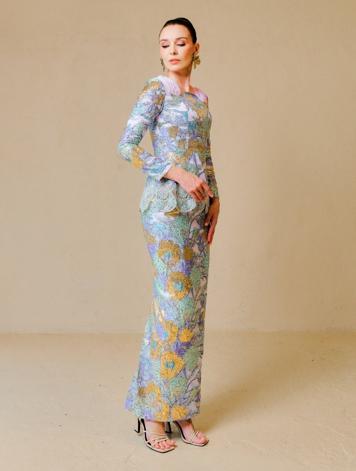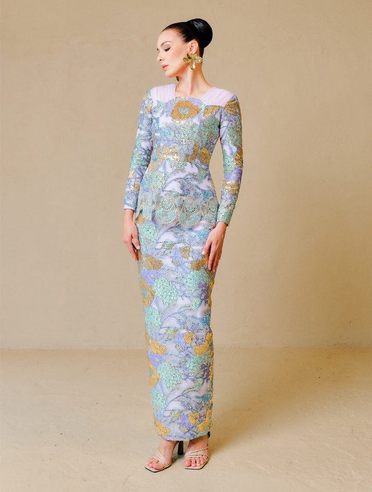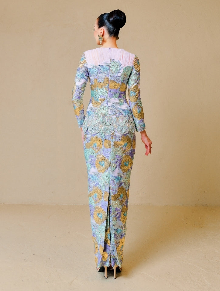 Zarwennie is crafted from luxurious fabric fully adorned with intricate tambour beadwork along the hemline. The material features ruched shoulder detailing and a smooth silk satin lining, offering both comfort and a refined, polished finish. Completed with a pencil-cut skirt, this ensemble embodies timeless sophistication.
