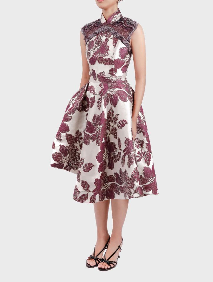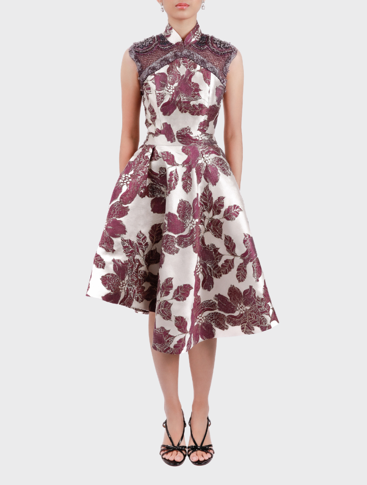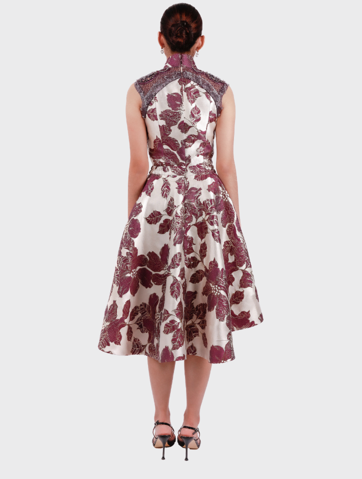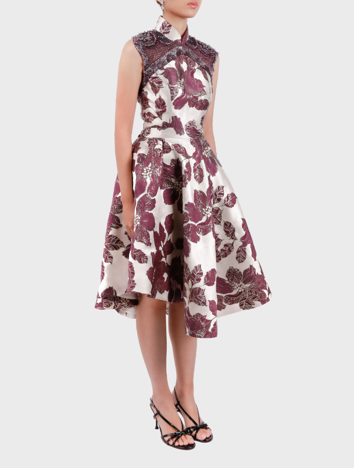 Zhi Xia in Aubergine Purple ensemble is crafted from luxurious silk brocade and artisanal jacquard, enriched with metallic accents and intricate beadwork. The sleeveless top features a jacquard base with satin lining, while the asymmetrical knee-length skirt is finished with an elastic waistband, side pockets, and a smooth satin lining.